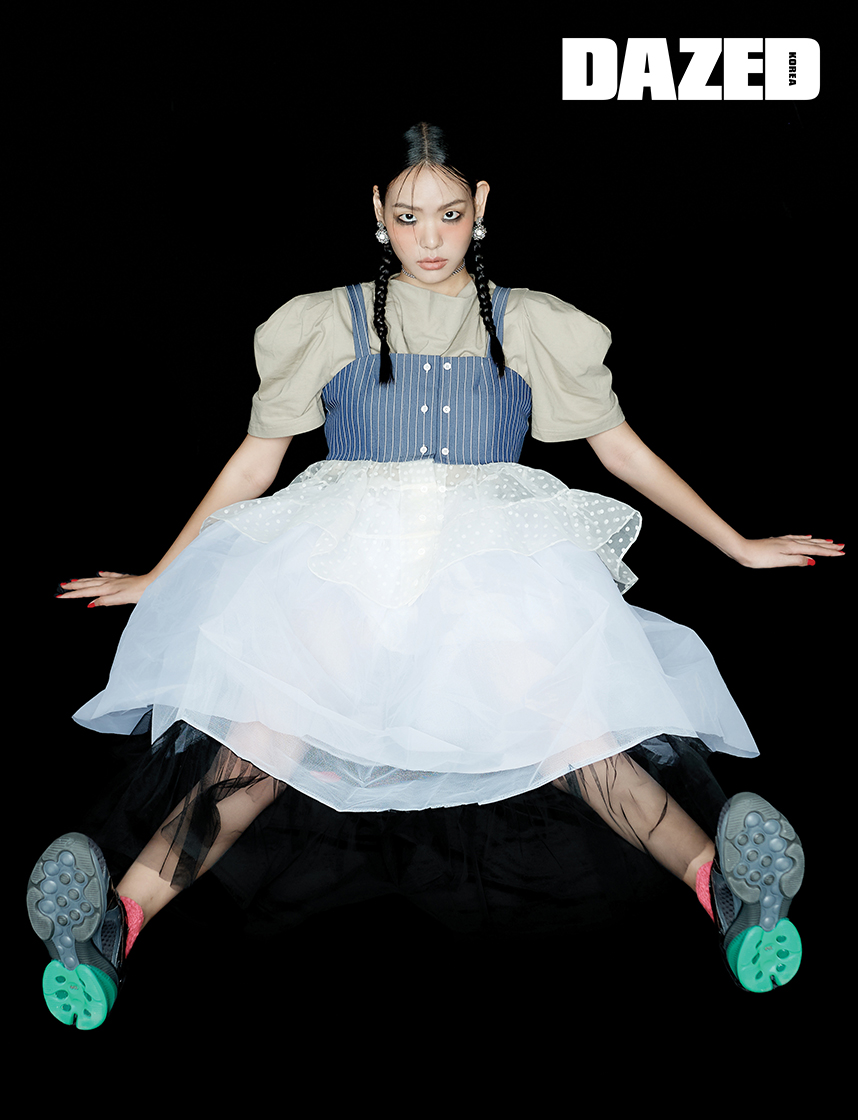 스트라이프 뷔스티에와 풍성한 볼륨감의 화이트 오간자 스커트, 이너로 매치한 티셔츠는 모두 듀이듀이(Dew E Dew E), 스니커즈는 아식스 스포츠스타일(ASICS SportStyle), 드롭 이어링과 실버 초커, 양말은 모두 에디터의 것.