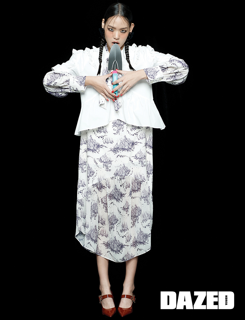 화이트 프릴 블라우스와 원피스는 듀이듀이(Dew E Dew E), 슈즈는 렉켄(Rekken), 리본 이어링은 에디터의 것.