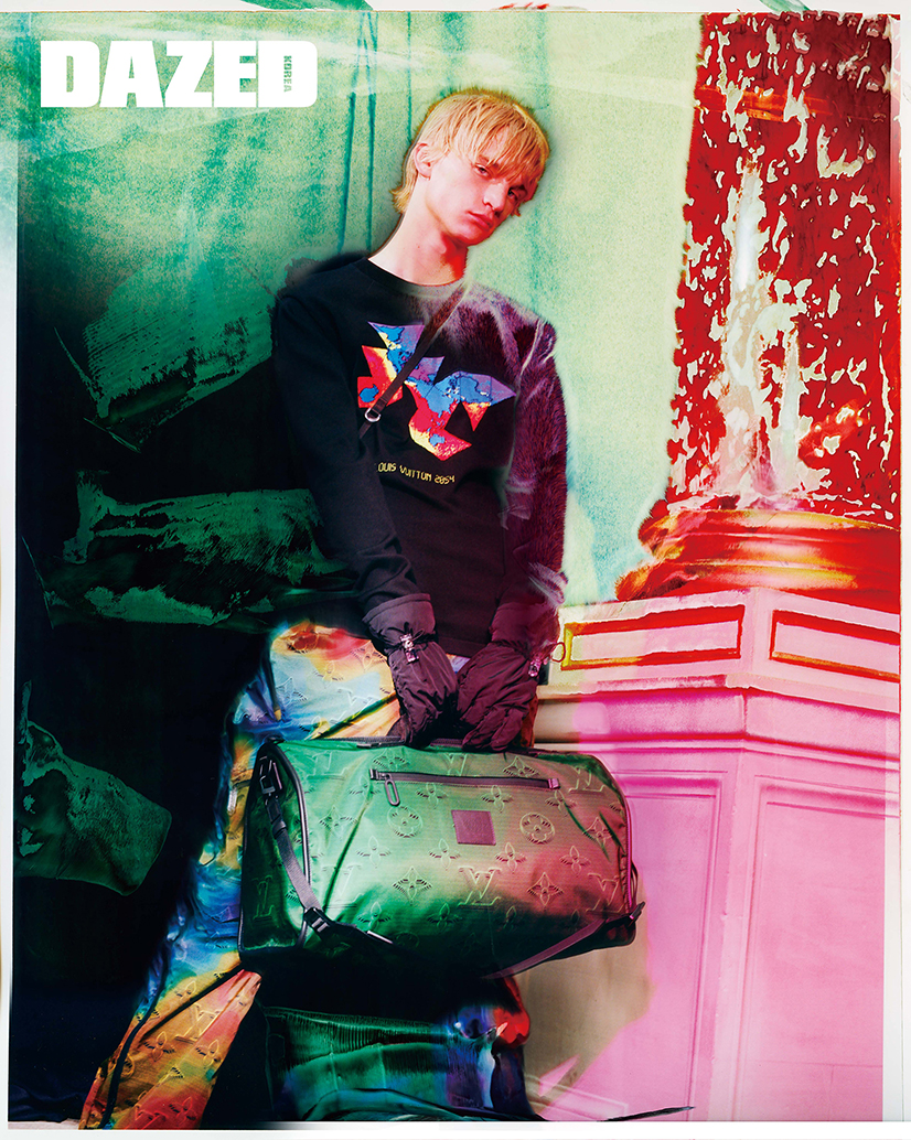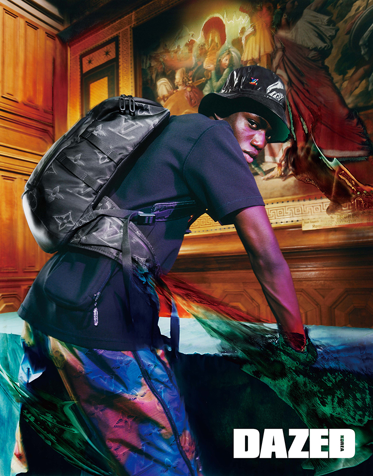 포켓 장식 티셔츠와 열기를 머금은 듯 연출한 멀티컬러 패턴 팬츠, 트랜스포머블 해트, 3D 모노그램 백팩은 모두 루이 비통(Louis Vuitton) 남성 2054 컬렉션.