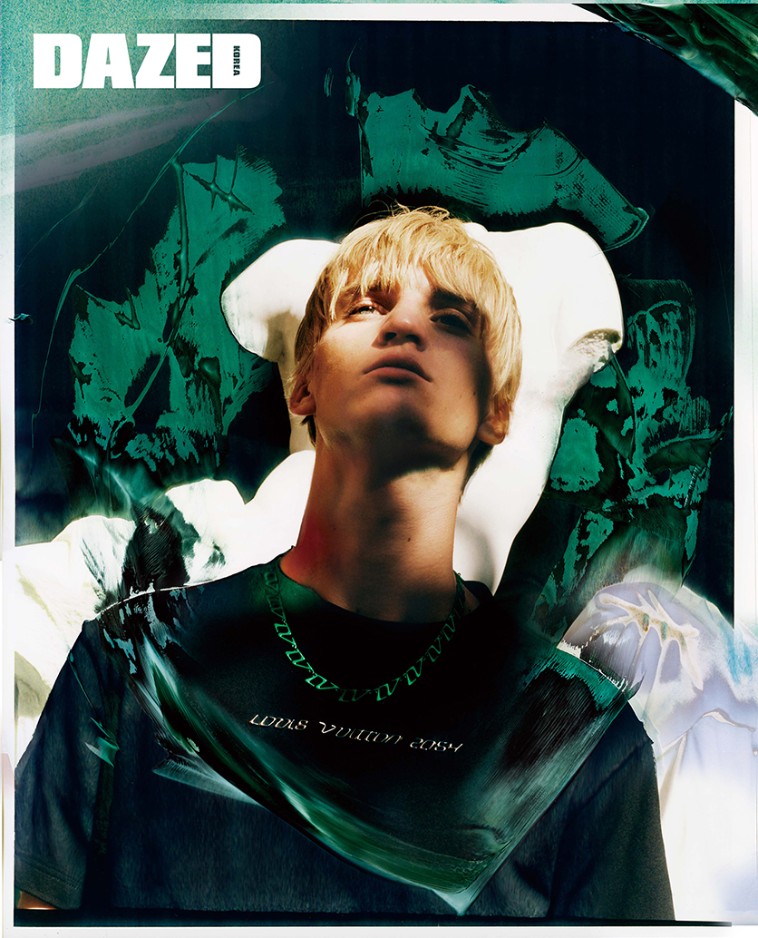 ‘Louis Vuitton 2054’를 프린트한 티셔츠와 체인 네크리스는 루이 비통(Louis Vuitton) 남성 2054 컬렉션.