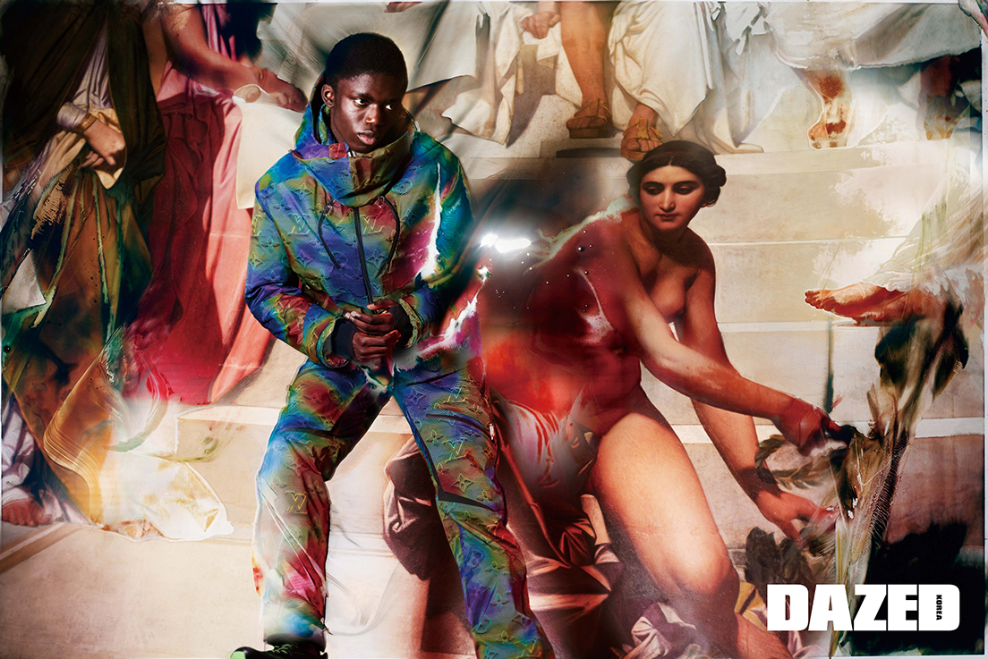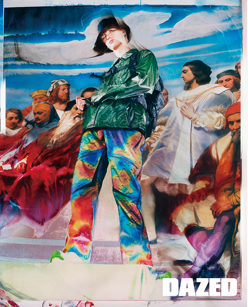 모노그램 나일론 점퍼와 멀티컬러 패턴 팬츠, 스니커즈, 트랜스포머블 해트, 모노그램 백팩은 모두 루이 비통(Louis Vuitton) 남성 2054 컬렉션.