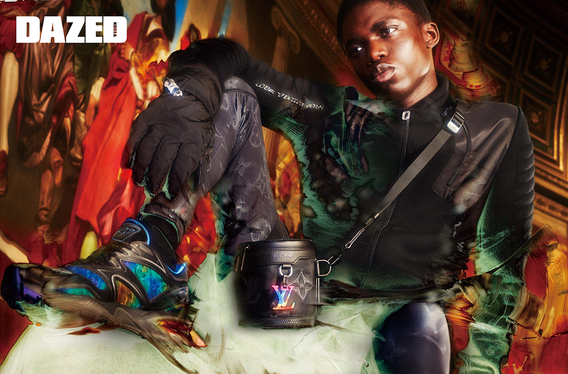 포켓 디테일의 집업 재킷과 모노그램 팬츠, 나일론 글러브, 3D 모노그램 미니 백, 스니커즈는 모두 루이 비통(Louis Vuitton) 남성 2054 컬렉션.