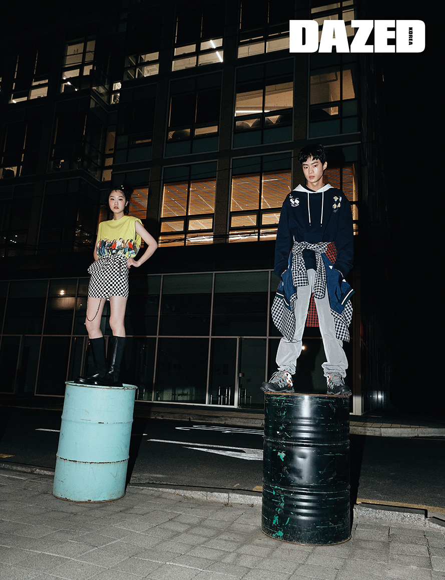 채령이 입은 공항 모티브 프린팅 슬리브리스 톱과 체크 패턴 스커트, 부츠는 모두 유저(Youser). 우석이 입은 후디 톱과 팬츠, 허리춤에 묶은 체크 패턴 셔츠, 스니커즈는 모두 유저(Youser).