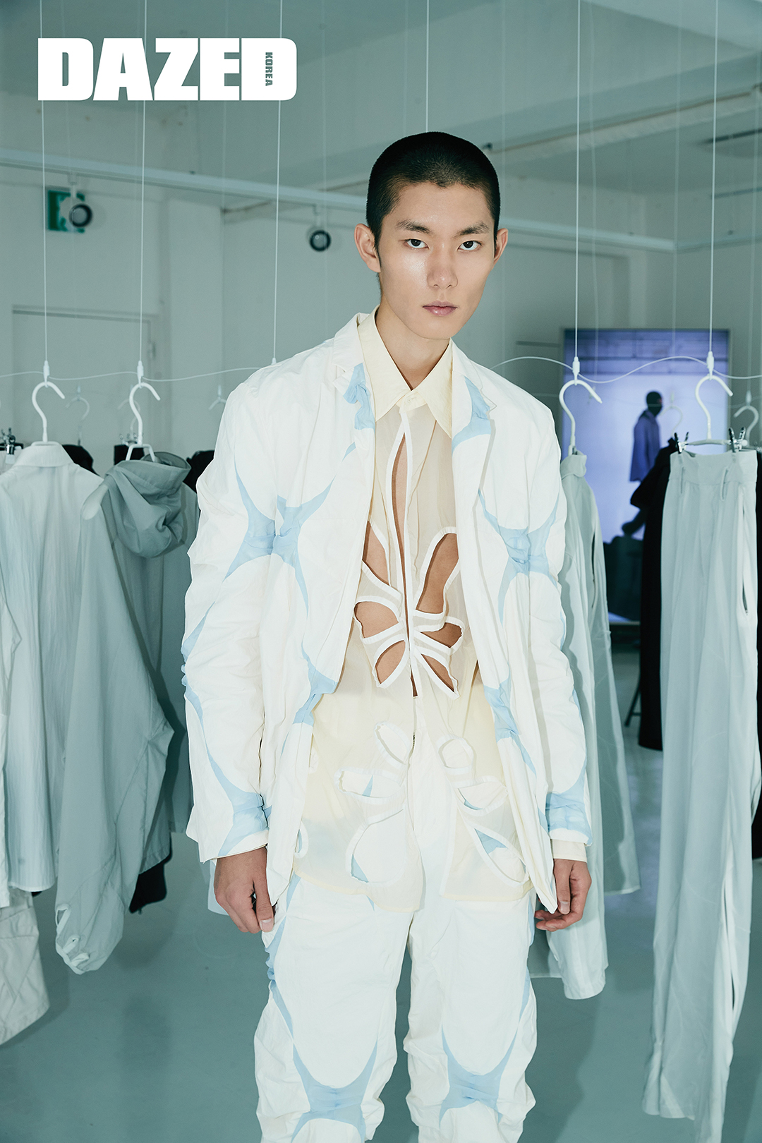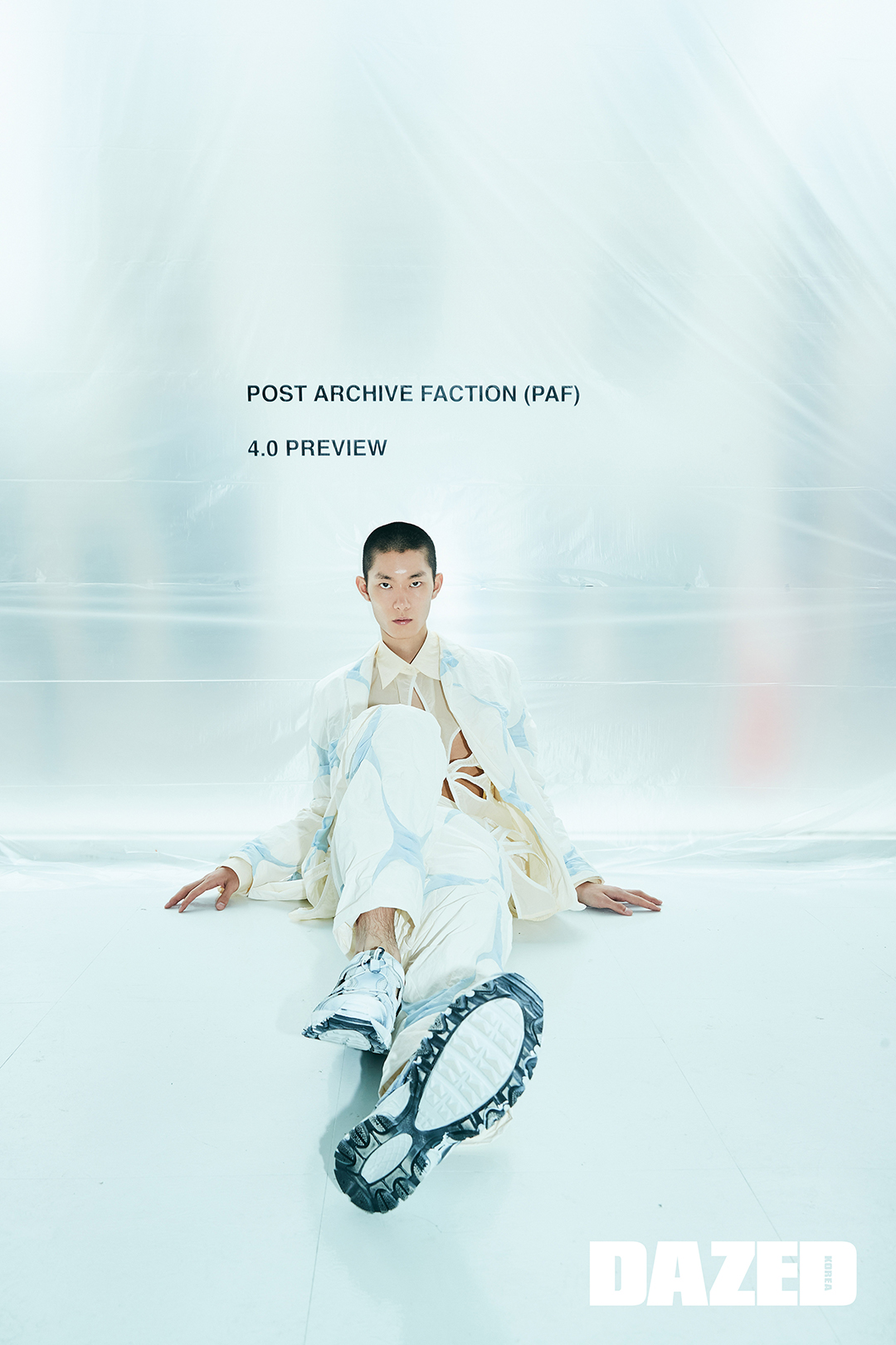 독특한 패턴의 슈트와 시스루 펀칭 디테일 셔츠, 스니커즈는 모두 포스트 아카이브 팩션(Post Archive Faction).