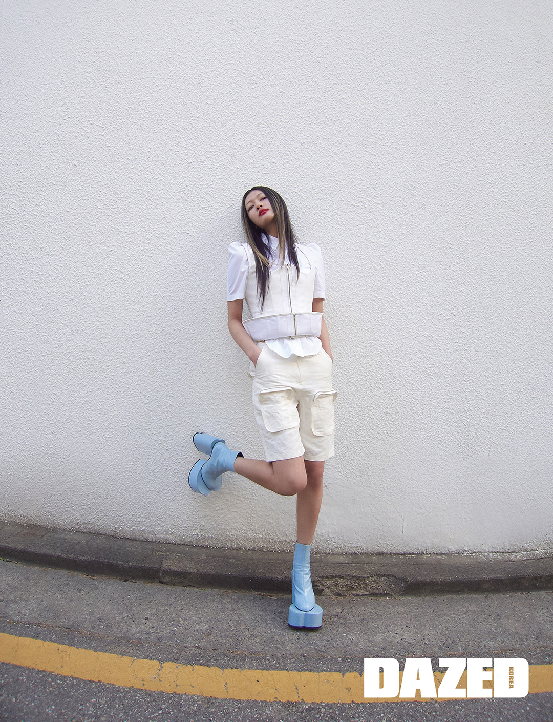 화이트 셔츠와 뷔스티에, 쇼츠, 블루 부츠는 모두 푸시버튼(pushBUTTON).