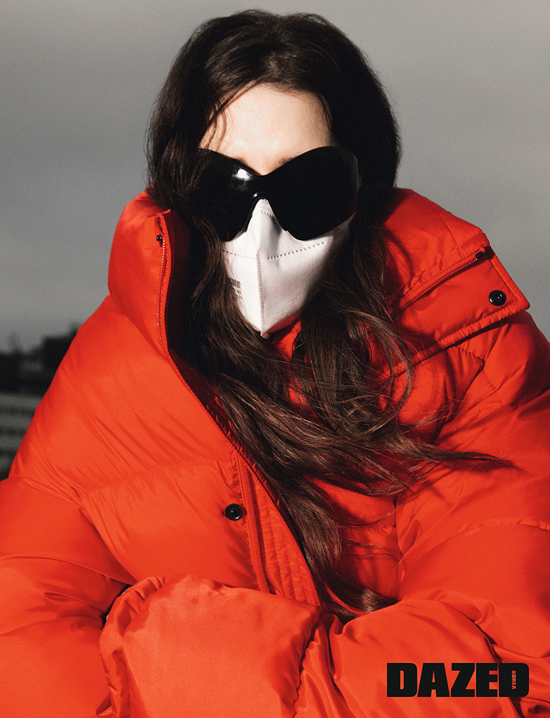 레드 푸퍼 점퍼와 마스크 버터플라이 선글라스는 발렌시아가(Balenciaga).
