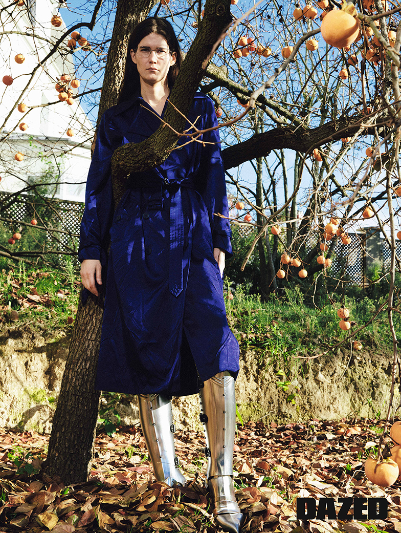 블루 트렌치코트와 슈발리에 오버 니 부츠는 발렌시아가(Balenciaga).