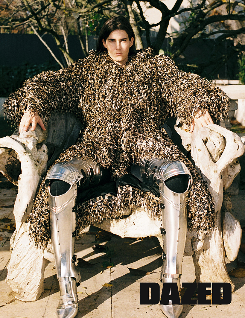 중세시대 갑옷 실루엣의 실버 아머 톱과 팬츠, 블랙 네오프렌 점프슈트, 슈발리에 슈즈, 글러브는 모두 발렌시아가(Balenciaga).