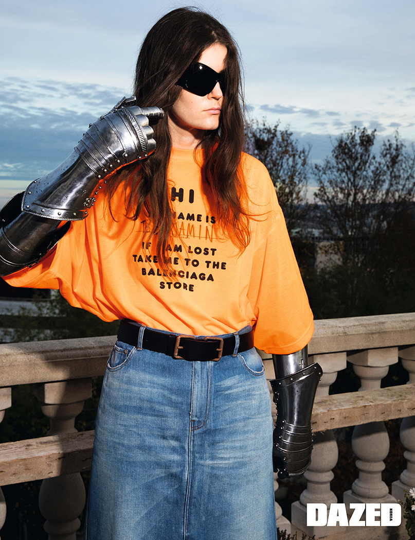 와이드 핏 티셔츠와 에이프런 스커트, 마스크 버터플라이 선글라스, 아머 글러브, 더블 버클 벨트는 모두 발렌시아가(Balenciaga).
