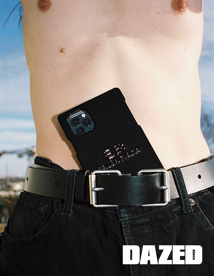 블랙 진과 롤러 더블 버클 벨트, 게이머 아이폰 케이스는 모두 발렌시아가(Balenciaga).