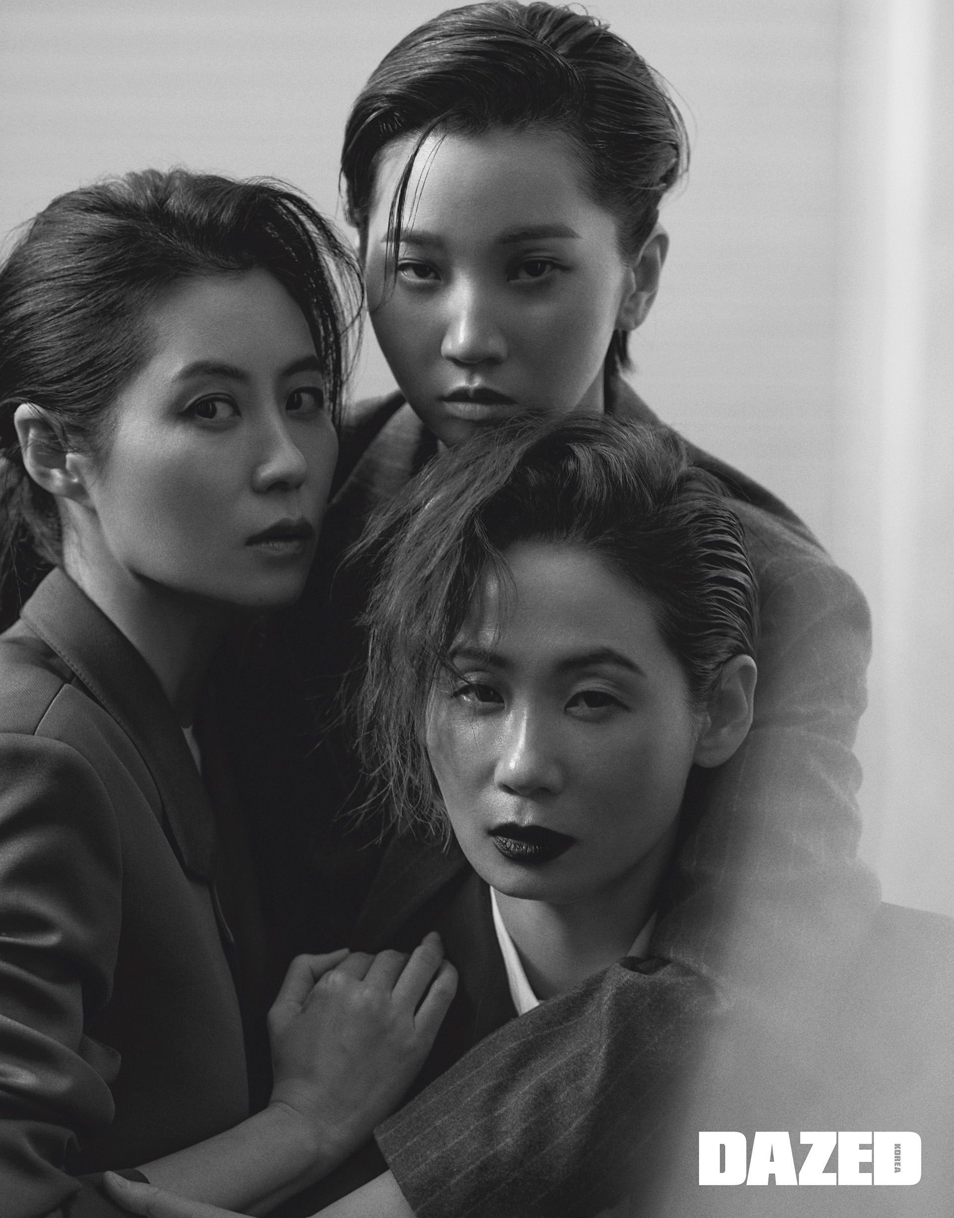 웃음 소리가 끊이지 않았다. 그건 단지 박차를 가하기 위해 치는 박수라기보다 정확한 순간을 향한 찬사이자 웃으며 주고받는 호흡이었다. “소리 언니, 지금 그 표정 너무 좋아.” “선영 언니, 지금 느낌 그대로.” 톱 모델 아니, 오늘은 배우이자 디렉터 역할로 촬영에 임한 장윤주의 사려 깊은 말이 카메라 앞에 선 문소리와 김선영의 사진에 조화롭게 포개졌다. “제가 먼저 언니들에게 제안했거든요. 우리, 영화 개봉할 때가 되면 꼭 잡지 화보를 찍자고.” 문소리의 시크한 스타일과 김선영의 아방가르드 룩 그리고 장윤주의 포멀한 슈트 룩은 모두 그의 생각에서 출발했다. “패션적이면서도 영화 스틸 컷처럼 미장센이 돋보이게 구성하고 싶었어요.”
