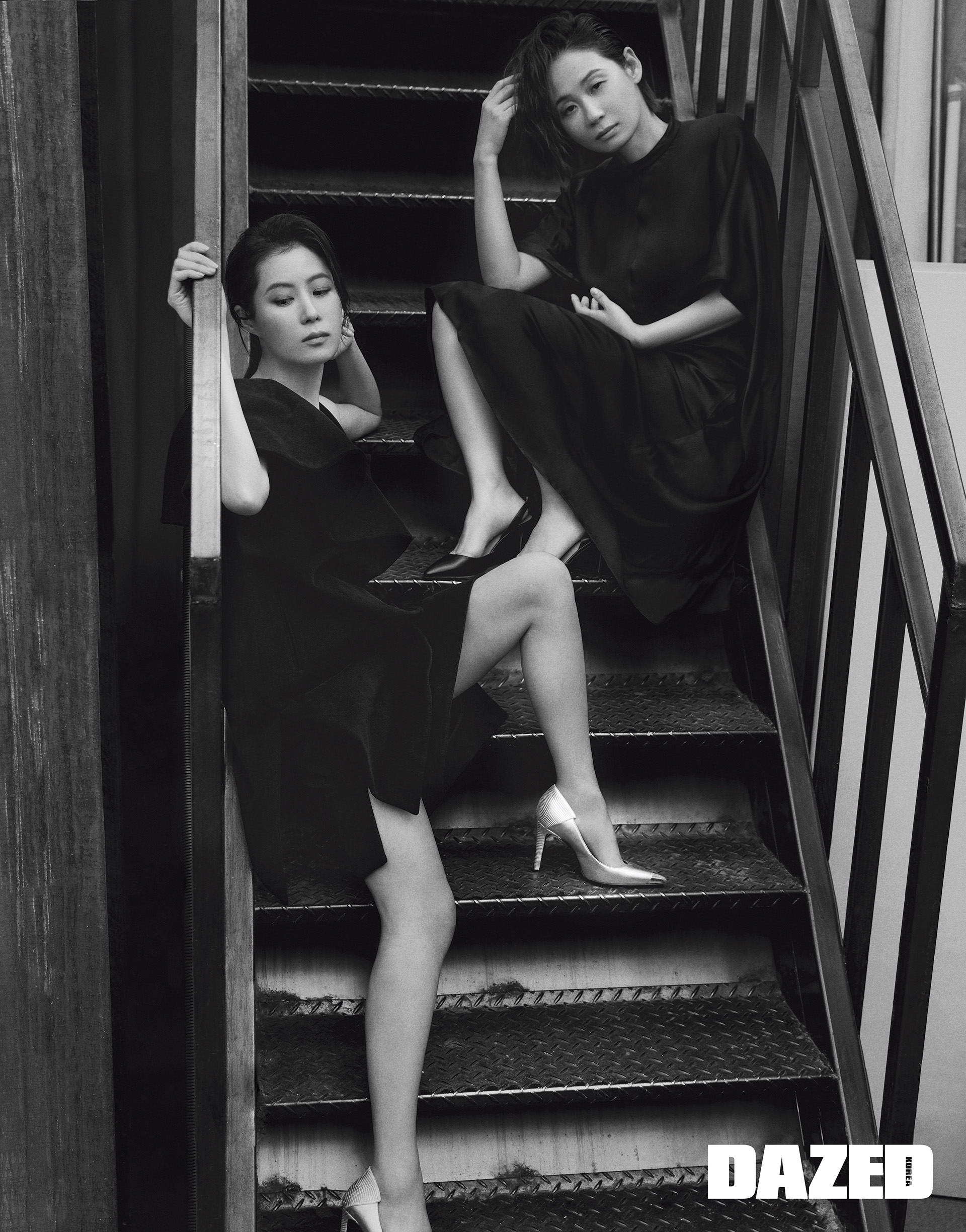소리가 입은 러플 장식 디테일 블랙 드레스는 리리(LEE y. LEE y), 스틸레토 힐은 쥬세페 자노티(Giuseppe Zanotti). 선영이 입은 벌룬 실루엣 드레스는 드미어(Demere), 슬링백 힐은 아쿠아주라 by 한스타일(Aquazzura by hanstyle.com).