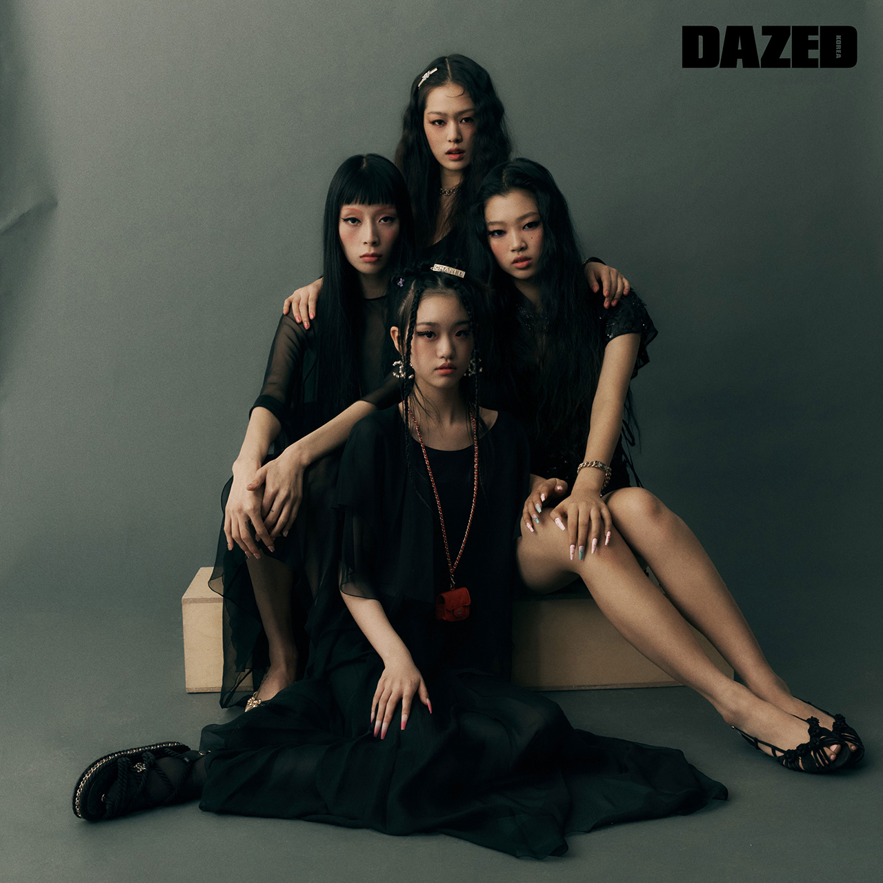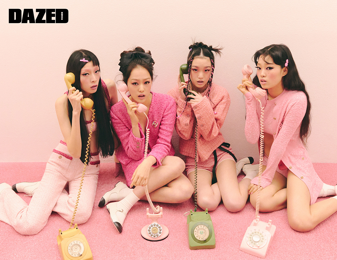 (왼쪽부터) 조앤이 입은 트위드 소재의 톱과 팬츠, 카프스킨 소재의 레이스업 슈즈는 모두 샤넬(Chanel), 헤어핀과 글러브는 스타일리스트의 것. 성민이 입은 트위드 소재의 재킷과 시퀸 브라톱, 스커트, 카프스킨 소재의 오픈 슈즈, 브로치, 블랙 리본 헤어핀은 모두 샤넬(Chanel). 영서가 입은 트위드 소재의 재킷과 코튼 폴리아미드 소재의 쇼츠, 카프스킨 소재의 오픈 슈즈, 램스킨 소재의 벨트는 모두 샤넬(Chanel). 윤지가 카디건으로 연출한 코튼 실크 소재의 드레스와 톱, 쇼츠, 패브릭 페이턴트 카프스킨 소재의 오픈 슈즈, 카프스킨 소재의 카드 홀더 벨트는 모두 샤넬(Chanel), 헤어핀은 스타일리스트의 것. 모델들이 신은 삭스는 모두 스타일리스트의 것.