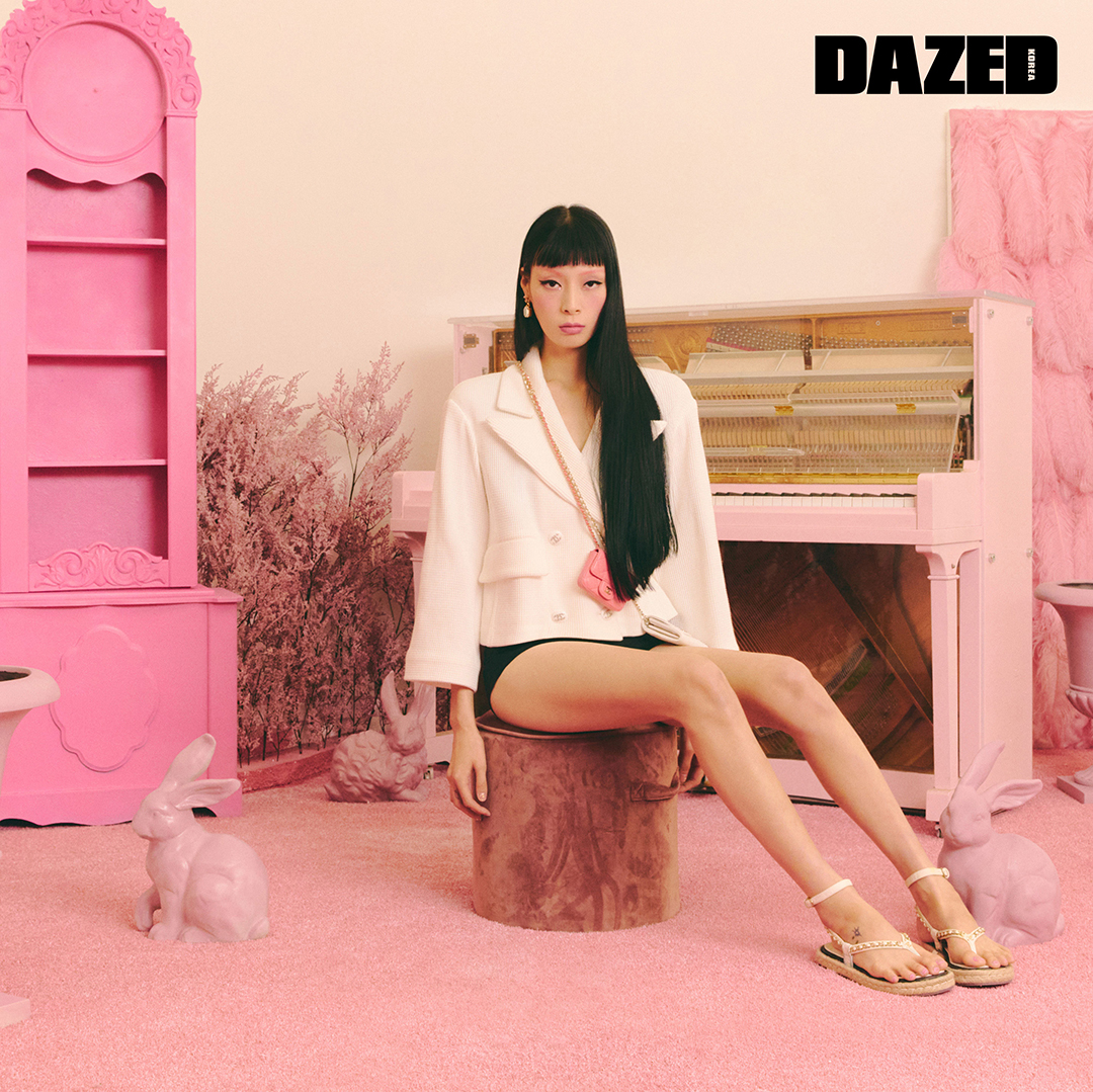 트위드 소재의 드레스와 노끈 소재 뮬, 헤어 클립, 브레이슬릿, 크로스백으로 연출한 샤이니 램스킨 소재의 펄스는 모두 샤넬(Chanel), 삭스는 스타일리스트의 것.
