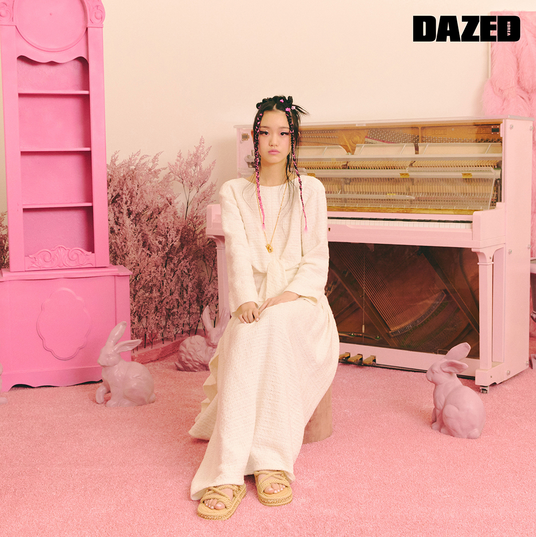 (왼쪽부터) 윤지가 입은 테리 클로스 소재 드레스와 메탈 스트라스 소재의 헤어 클립, 이어링, 램스킨 소재의 플랩 백은 모두 샤넬(Chanel).