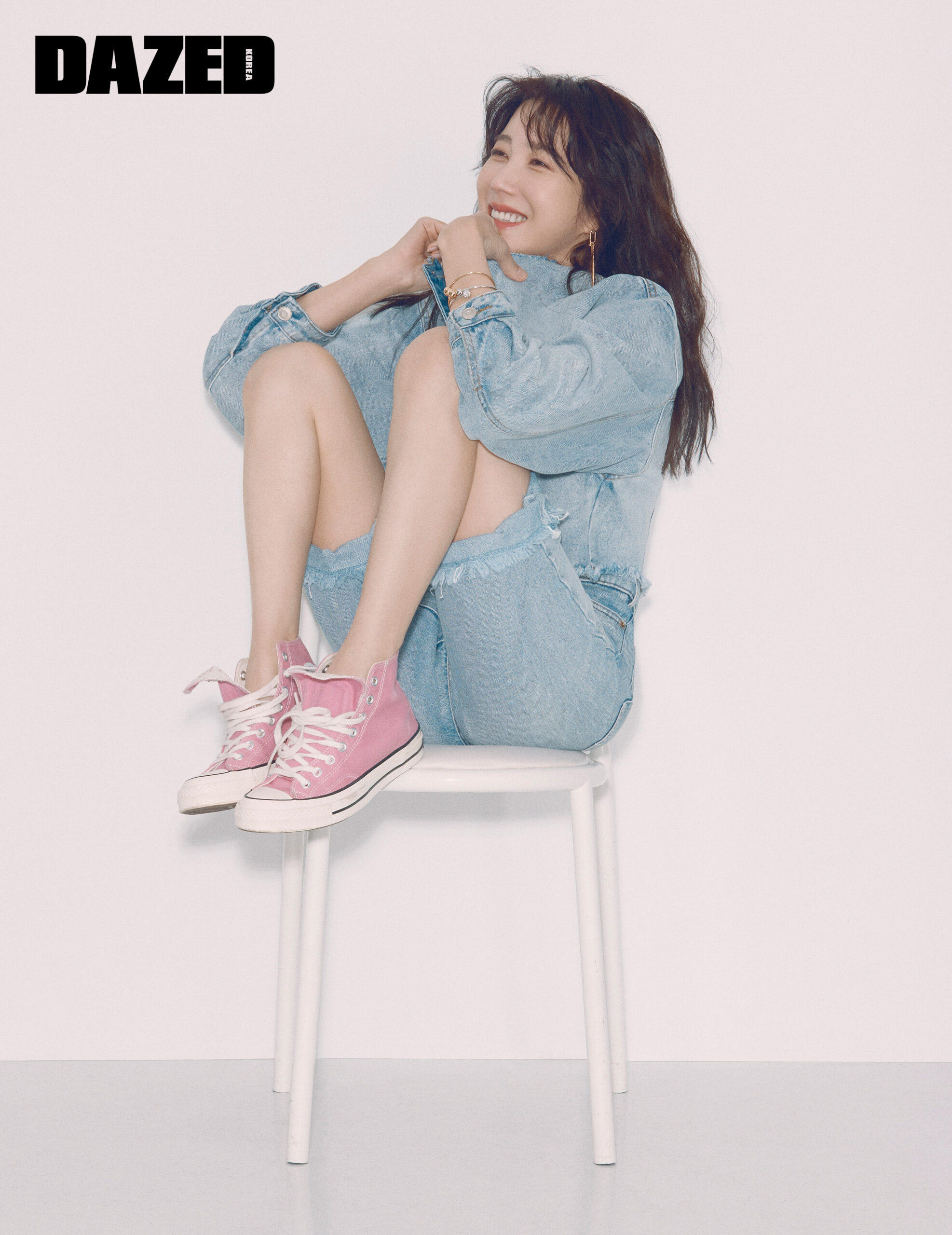 커팅 디테일의 크롭트 데님 재킷은 8 by 육스(8 by YOOX), 롤업한 데님 팬츠는 미우 미우(Miu Miu), 18K 로즈 골드의 티파니 하드웨어 더블 롱 링크 이어링과 레어어드한 볼 바이패스 브레이슬릿, 볼 링은 모두 티파니(Tiffany & Co.), 핑크 컬러 하이톱 스니커즈는 컨버스(Converse).
