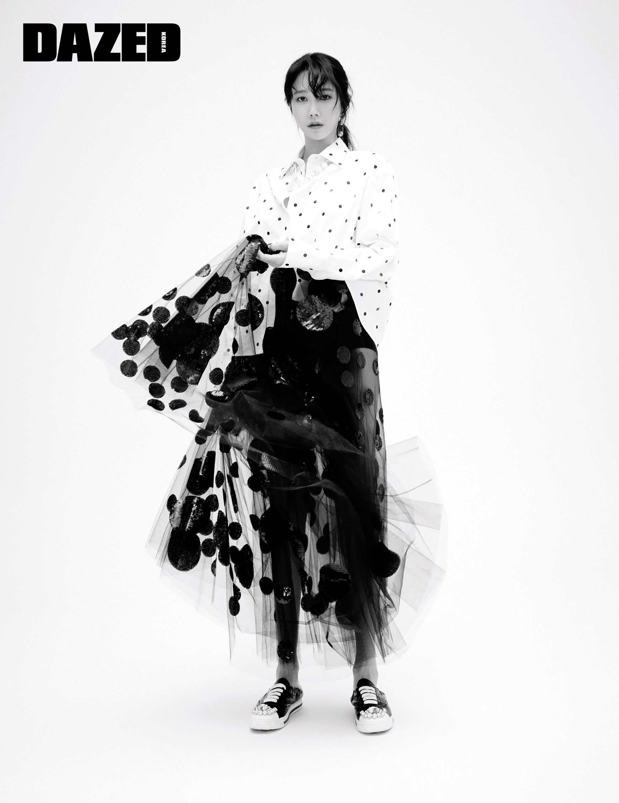 도트 패턴 화이트 셔츠와 스팽글 디테일의 블랙 샤 스커트는 발렌티노(Valentino), 18K 옐로 골드의 트리플 드롭 이어링은 티파니(Tiffany & Co.), 큐빅 장식의 블랙 스니커즈는 미우 미우(Miu Miu), 빈티지 네크리스는 벨앤누보(Bell & Nouveau).