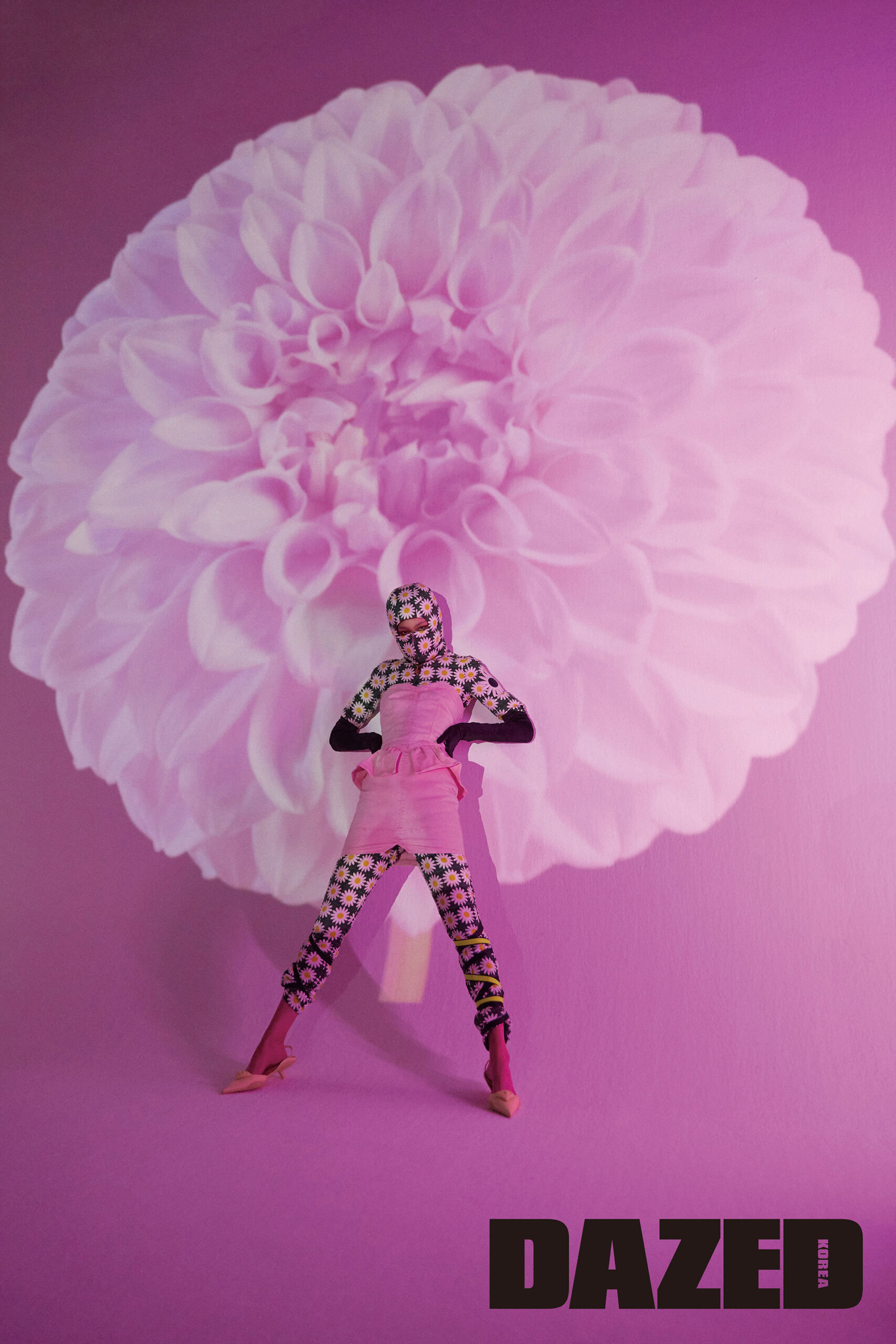 라워 패턴 푸퍼 보디슈트는 8 몽클레르 리차드 퀸(8 Moncler Richard Quinn), 핑크 미니드레스는 이자벨 마랑(Isabel Marant), 키튼힐 슬링백은 프라다(Prada), 네크리스는 디올(Dior), 블랙 글러브와 다리에 감은 블랙 타이, 형광색 랜야드는 모두 에디터의 것.