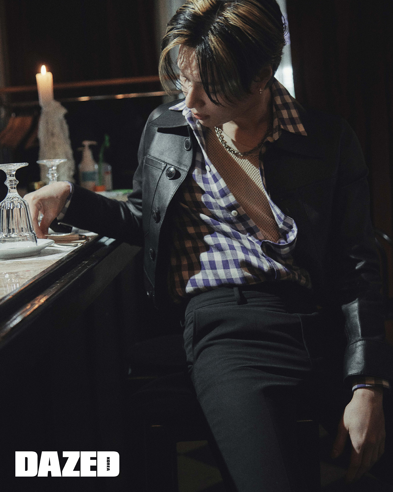 크롭트 레더 재킷과 체크 패턴의 클래식 셔츠, 뉴트럴 컬러의 피시넷 탱크톱, 시가렛 핏 트라우저는 모두 아미(Ami), 실버 체인 네크리스는 스타일리스트의 것.