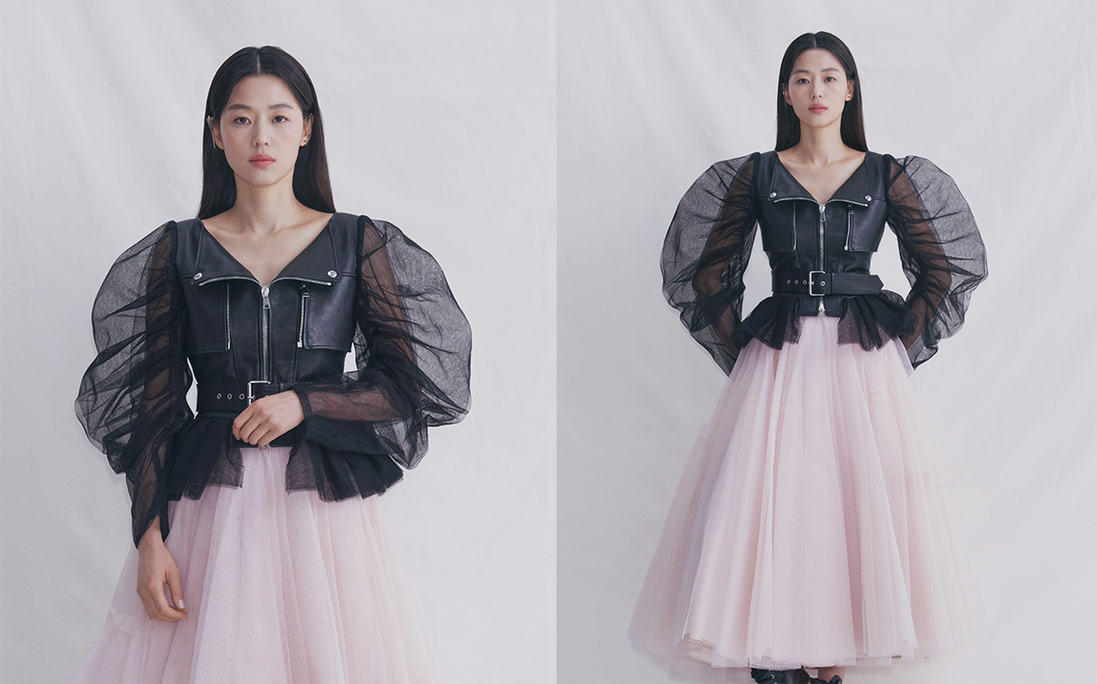 맥퀸의 크리에이티브 디렉터 사라 버튼은 전지현과 함께한 알렉산더 맥퀸의 2021 봄/여름 여성 컬렉션을 통 해 옷의 뼈대, 그 본질로 돌아가 형태, 실루엣, 그리고 볼륨의 아름다움을 표현했다. 나비를 연상케 하는 블랙 튤 소재의 해체적인 볼륨 디테일 소매와 페플럼이 만난 레더 바이커 재킷과 블러시 색상의 스커트는 이번 컬렉션의 핵심 디테일인 형태, 실루엣, 볼륨을 극대화하여 옷의 뼈대와 본질을 보여주었다.