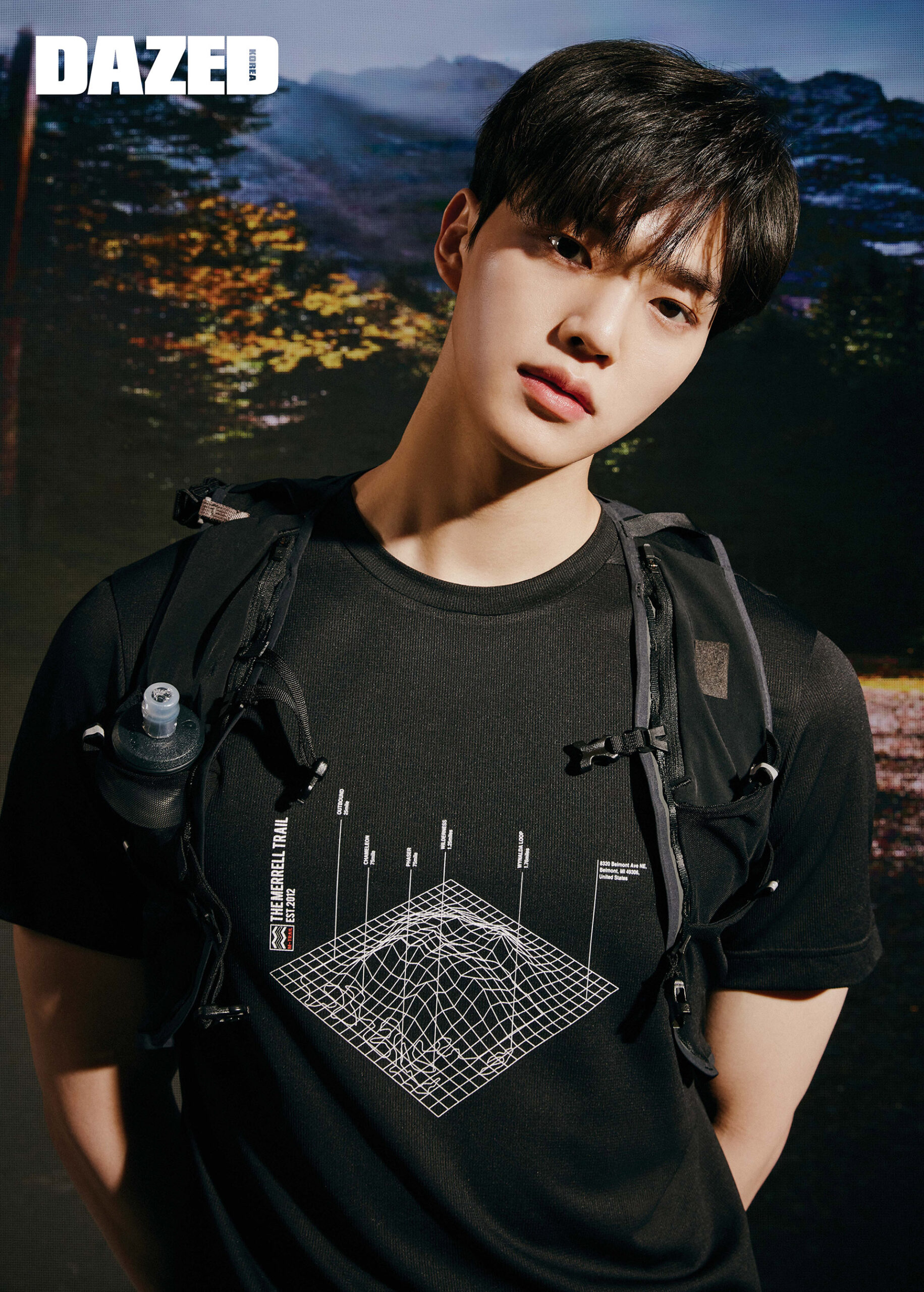 트래픽 그래픽 반팔 티셔츠와 M 트레일 러닝 팩은 머렐(MERRELL).