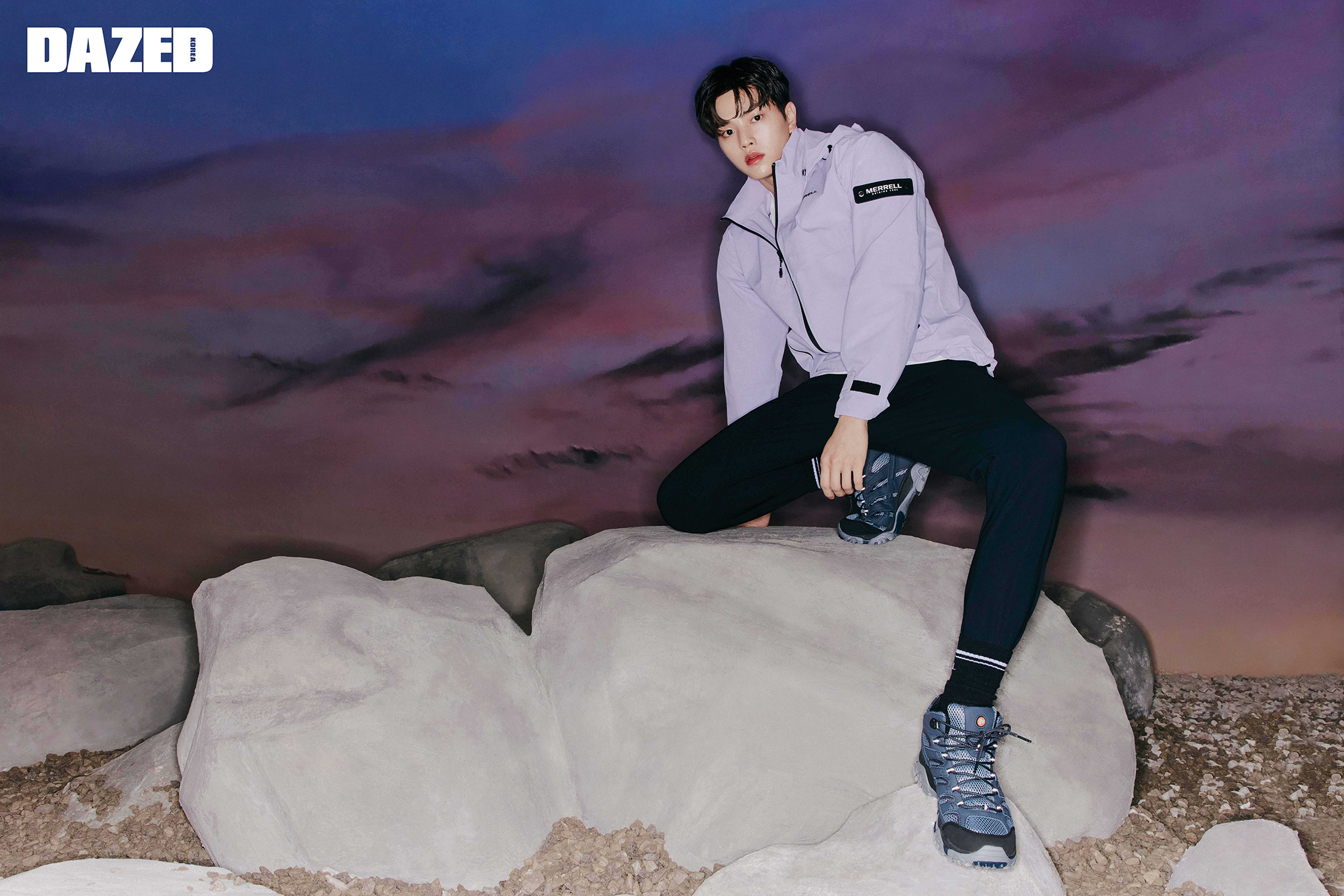 라벤더 컬러의 윈드브레이커 재킷과 트레이닝 조거 팬츠, 로고 삭스, 모압 2 미드 GTX는 모두 머렐(MERRELL).