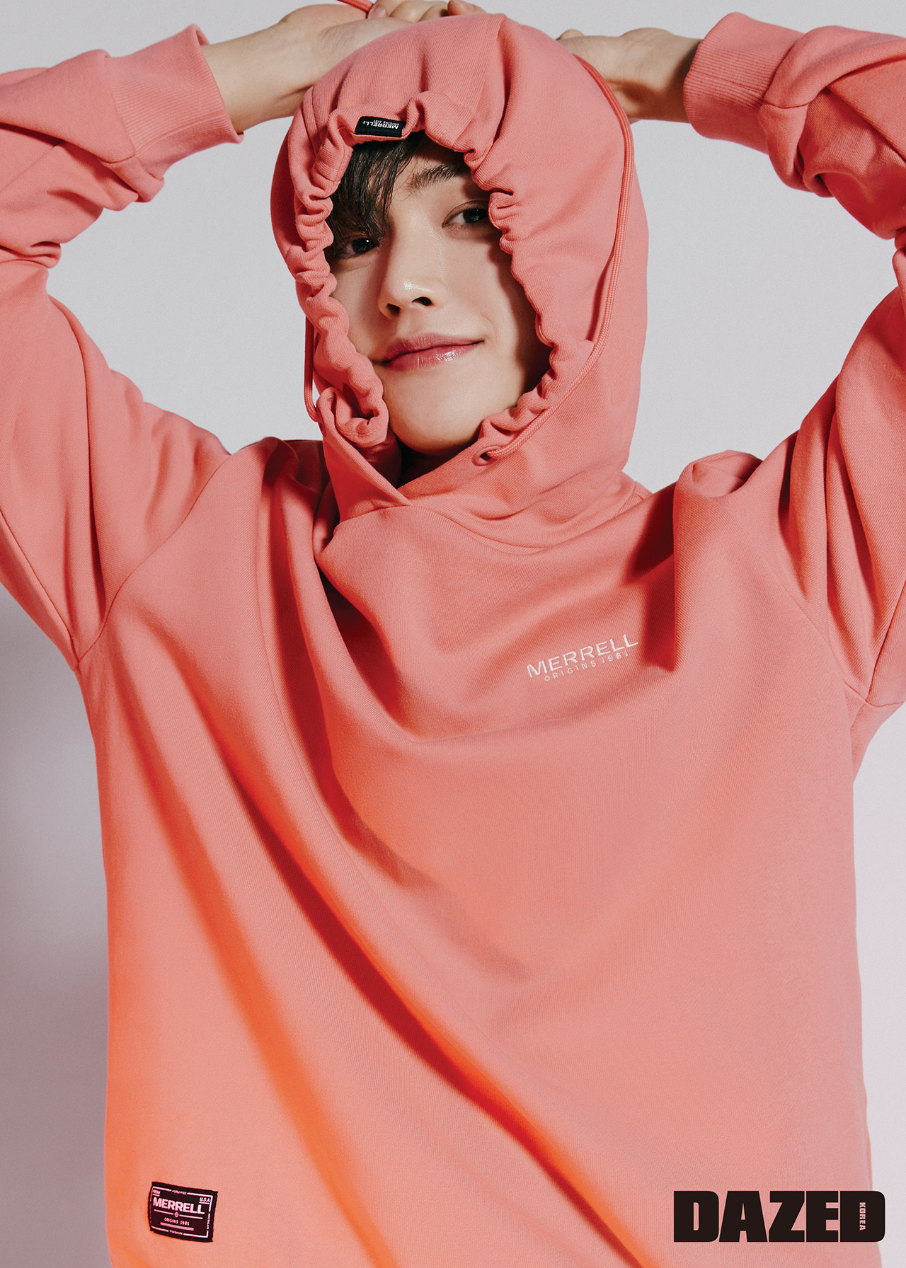 리사이클 소재의 핑크 후드 톱은 머렐(MERRELL).