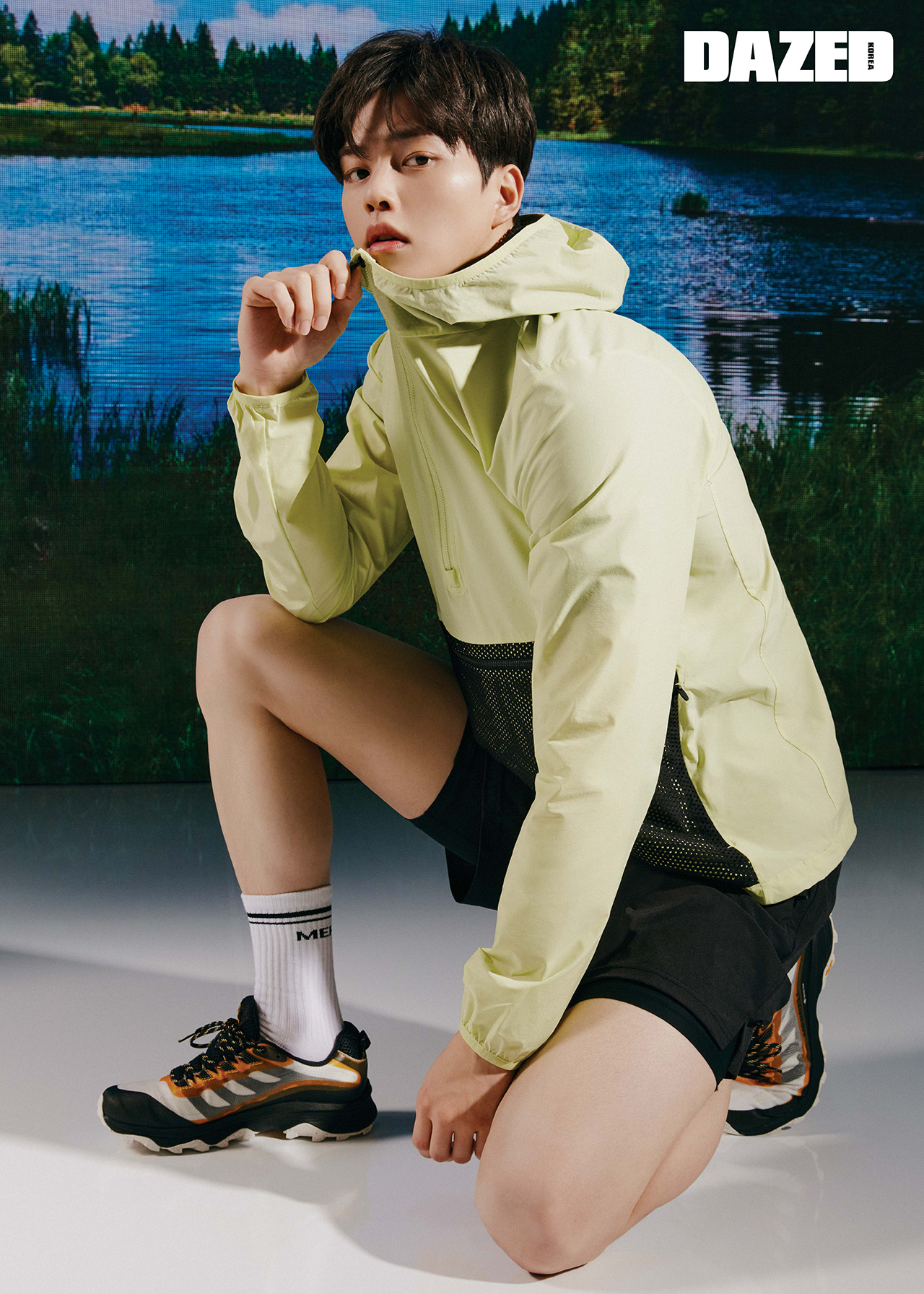 메시 포켓 디테일의 패커블 트레일 재킷과 2 in 1 하프 팬츠, 로고 삭스, 모압 스피드 GTX는 모두 머렐(MERRELL).