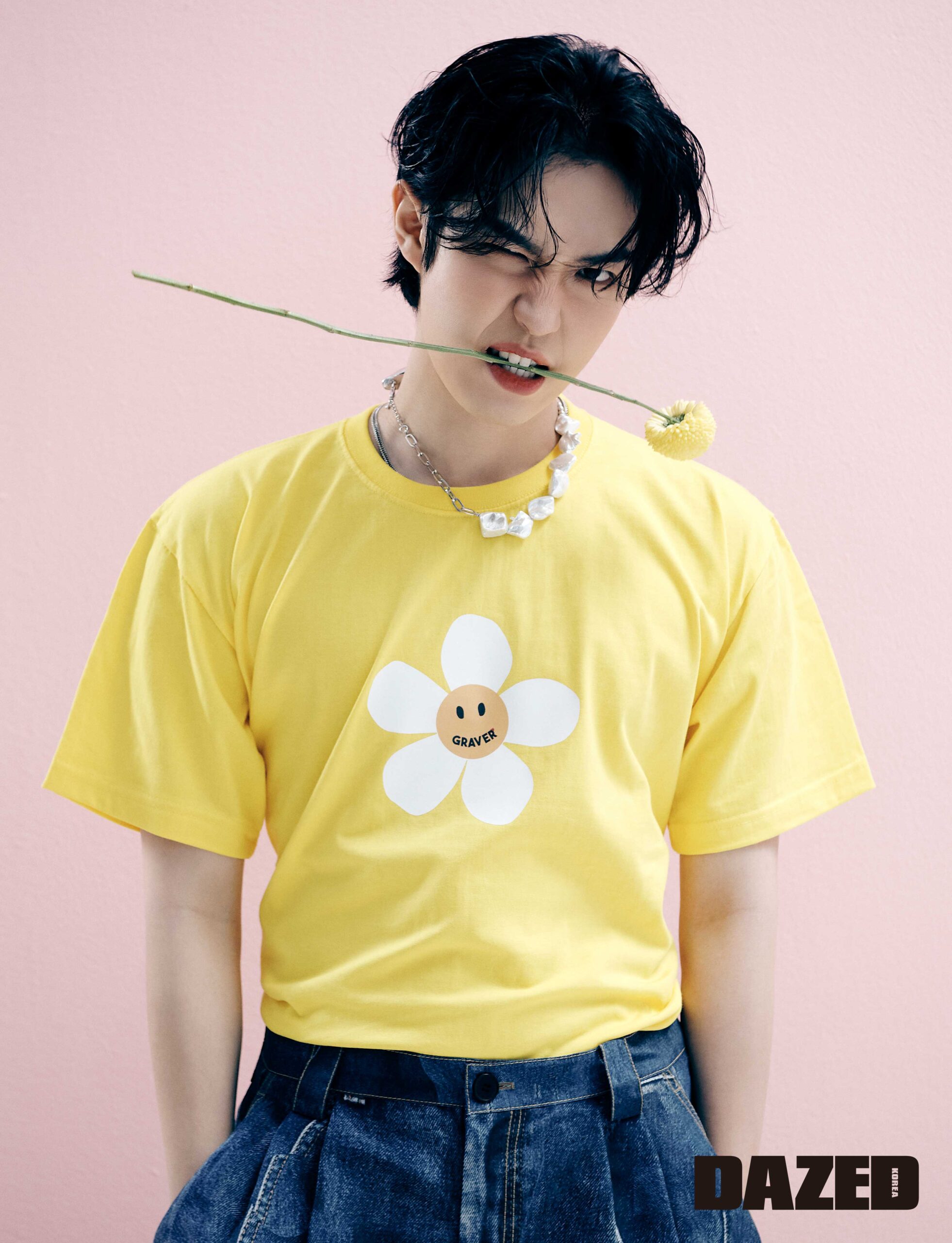 플라워 프린트 티셔츠는 그레이버(Graver), 데님 프린트 쇼츠는 더 뮤지엄 비지터(The Museum Visitor), 진주 네크리스는 허자보이(Hurjaboy), 레이어링한 실버 네크리스는 포트레이트 리포트(Portrait Report).
