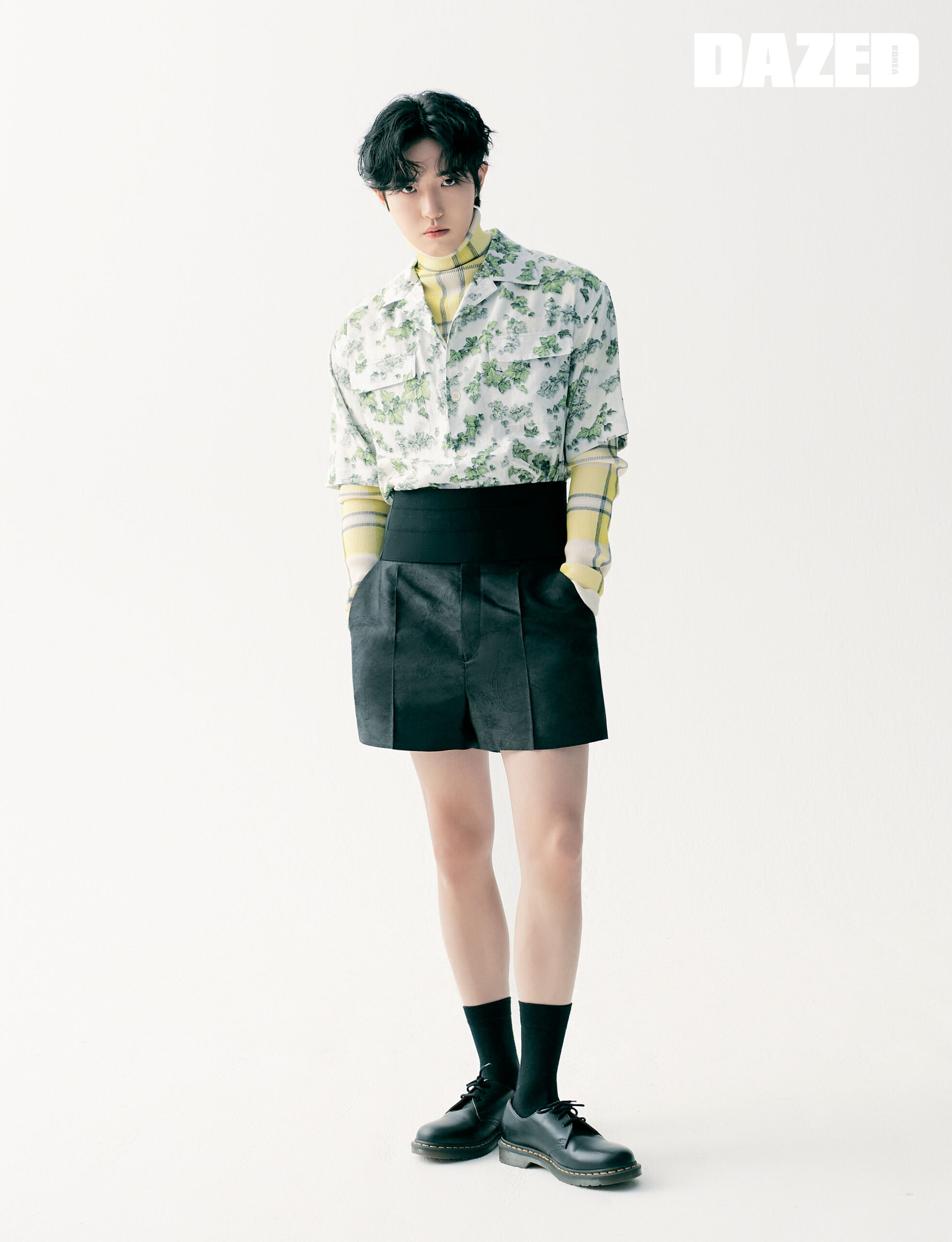 체크 터틀넥 티셔츠와 하와이안 셔츠, 벨트와 블랙 쇼츠는 모두 디올(Dior), 로퍼는 닥터마틴(Dr. Martens), 양말은 에디터의 것.