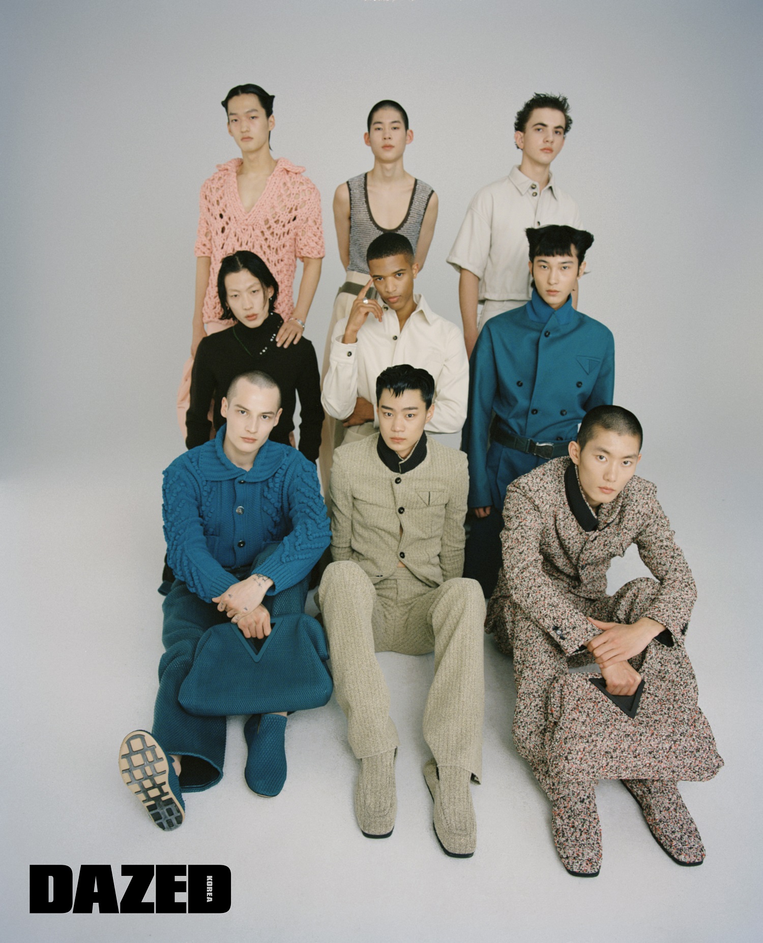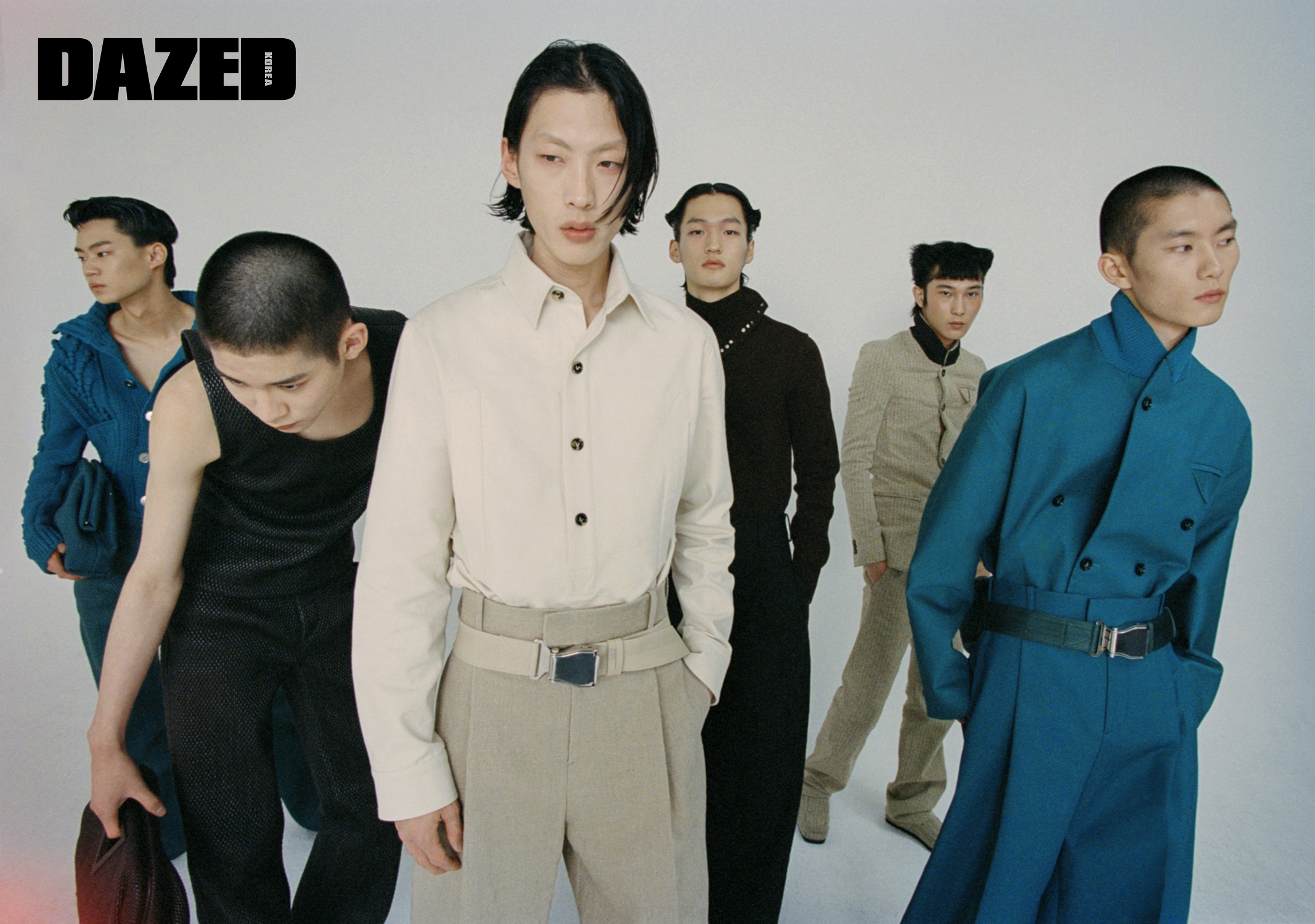 우석이 입은 니트 톱과 레더 팬츠, 같은 소재 트라이앵글 백은 모두 보테가 베네타(Bottega Veneta). 효진이 입은 아이코닉한 삼각형 디테일 부클레 소재 슈트와 같은 소재 슈즈는 보테가 베네타(Bottega Veneta). 태민이 입은 코튼 셔츠와 리넨 캔버스 팬츠, 비행기 안전벨트에서 영감받아 탄생한 벨트 백은 모두 보테가 베네타(Bottega Veneta). 승찬이 입은 니트 터틀넥 톱과 코튼 팬츠는 보테가 베네타(Bottega Veneta). 진희가 입은 퀼티드 레더 셋업과 같은 소재 트라이앵글 백은 보테가 베네타(Bottega Veneta). 재지가 입은 코튼 소재 셋업과 비행기 안전벨트에서 영감받아 탄생한 벨트 백은 보테가 베네타(Bottega Veneta).