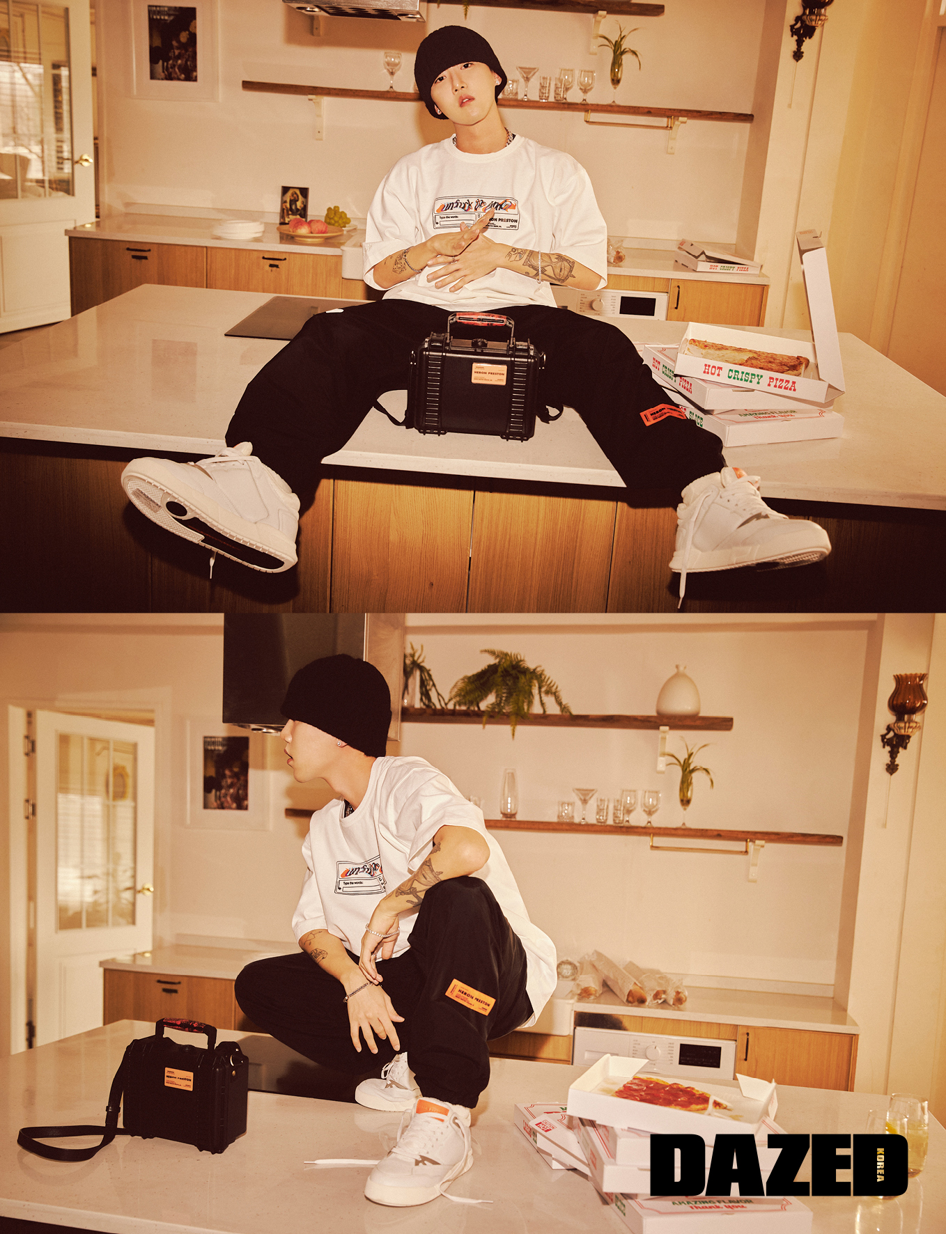화이트 레터링 티셔츠와 블랙 스웨트팬츠, 화이트 스니커즈, 블랙 툴 박스 숄더 백은 모두 헤론 프레스턴(Heron Preston), 비니와 이어링, 네크리스, 브레이슬릿은 모두 휘민의 것.