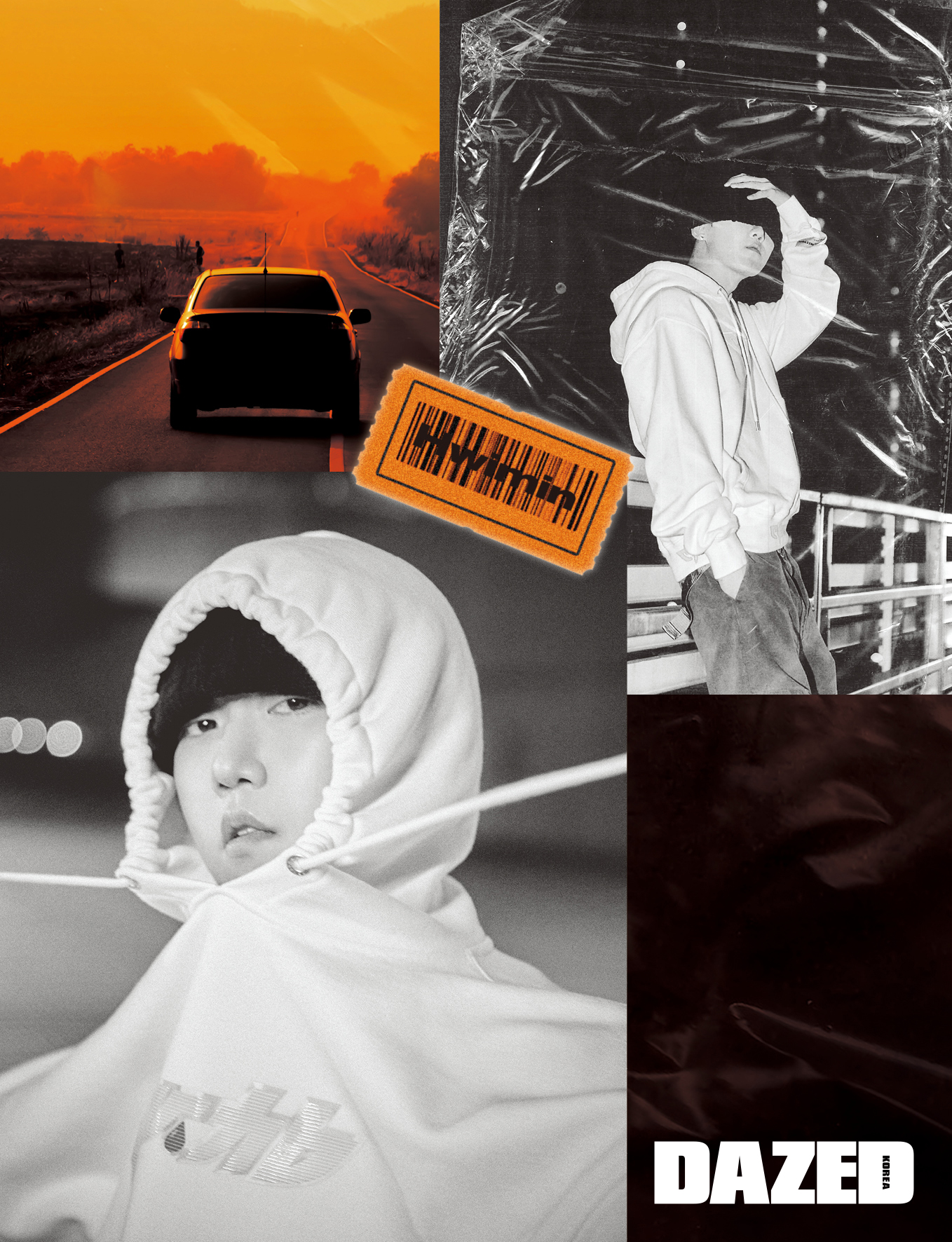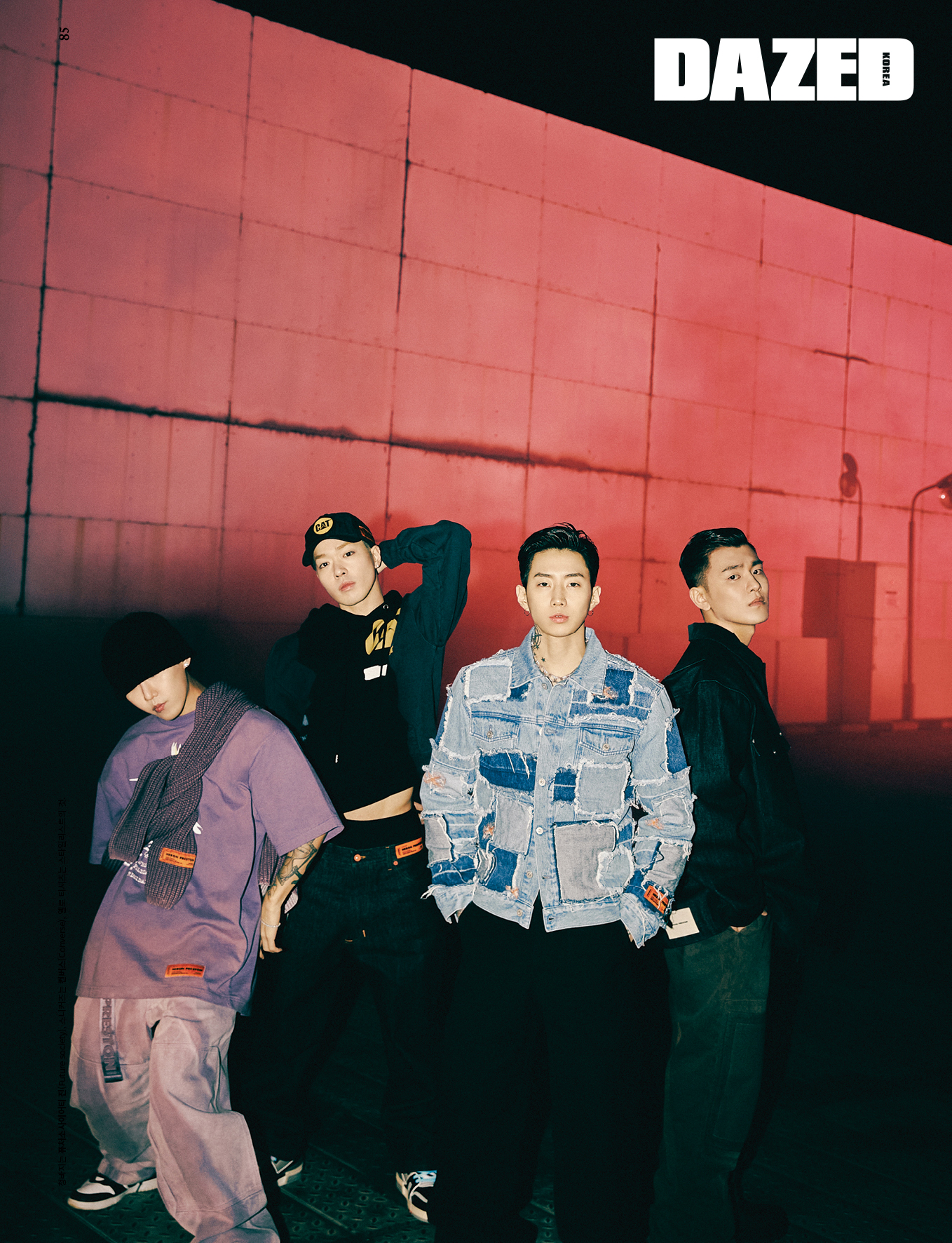 재범이 입은 패치워크 트러커 데님 재킷과 블랙 데님 팬츠, 실버 네크리스는 모두 헤론 프레스턴(Heron Preston), 노즈 피어싱과 이어링은 재범의 것. 제미나이가 입은 멀티컬러 패턴 후디와 로고 태그 블랙 데님 팬츠, 트러커 캡은 모두 헤론 프레스턴(Heron Preston), 이어링은 제미나이의 것, 스니커즈는 스타일리스트의 것. 휘민이 입은 퍼플 티셔츠와 퍼플 플레인 스웨터, 퍼플 데님 팬츠는 모두 헤론 프레스턴(Heron Preston), 비니와 이어링, 브레이슬릿은 모두 휘민의 것, 스니커즈는 스타일리스트의 것. 규정이 입은 데님 트러커 재킷과 티셔츠, 블랙 데님 팬츠는 모두 헤론 프레스턴(Heron Preston).