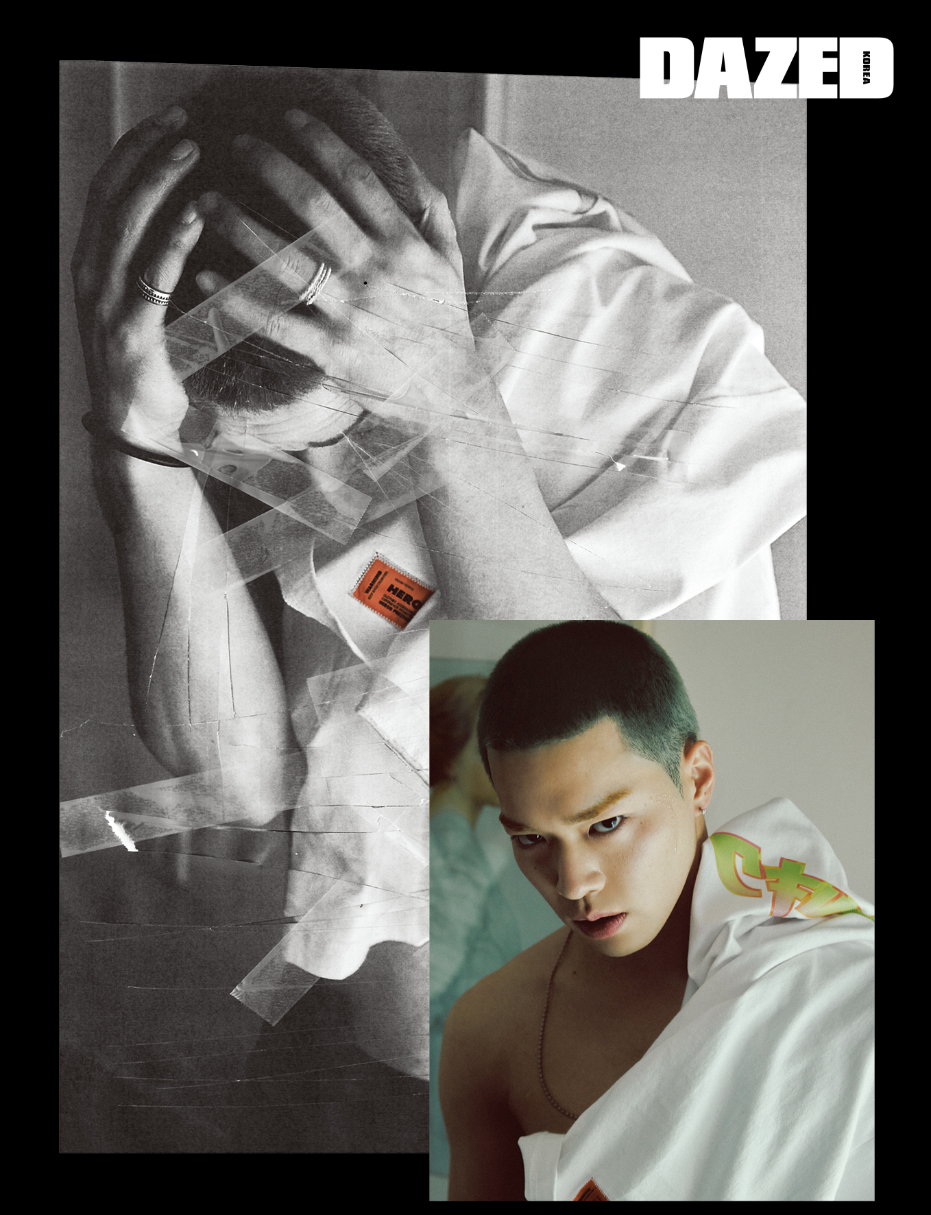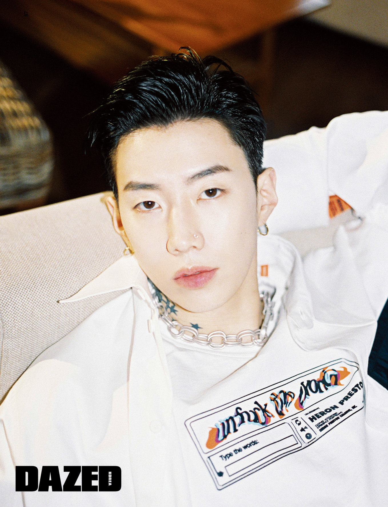블랙 포켓 디테일의 화이트 셔츠와 화이트 레터링 티셔츠, 그레이 데님 팬츠, 실버 네크리스, 화이트 스니커즈는 모두 헤론 프레스턴(Heron Preston), 노즈 피어싱과 이어링은 재범의 것.