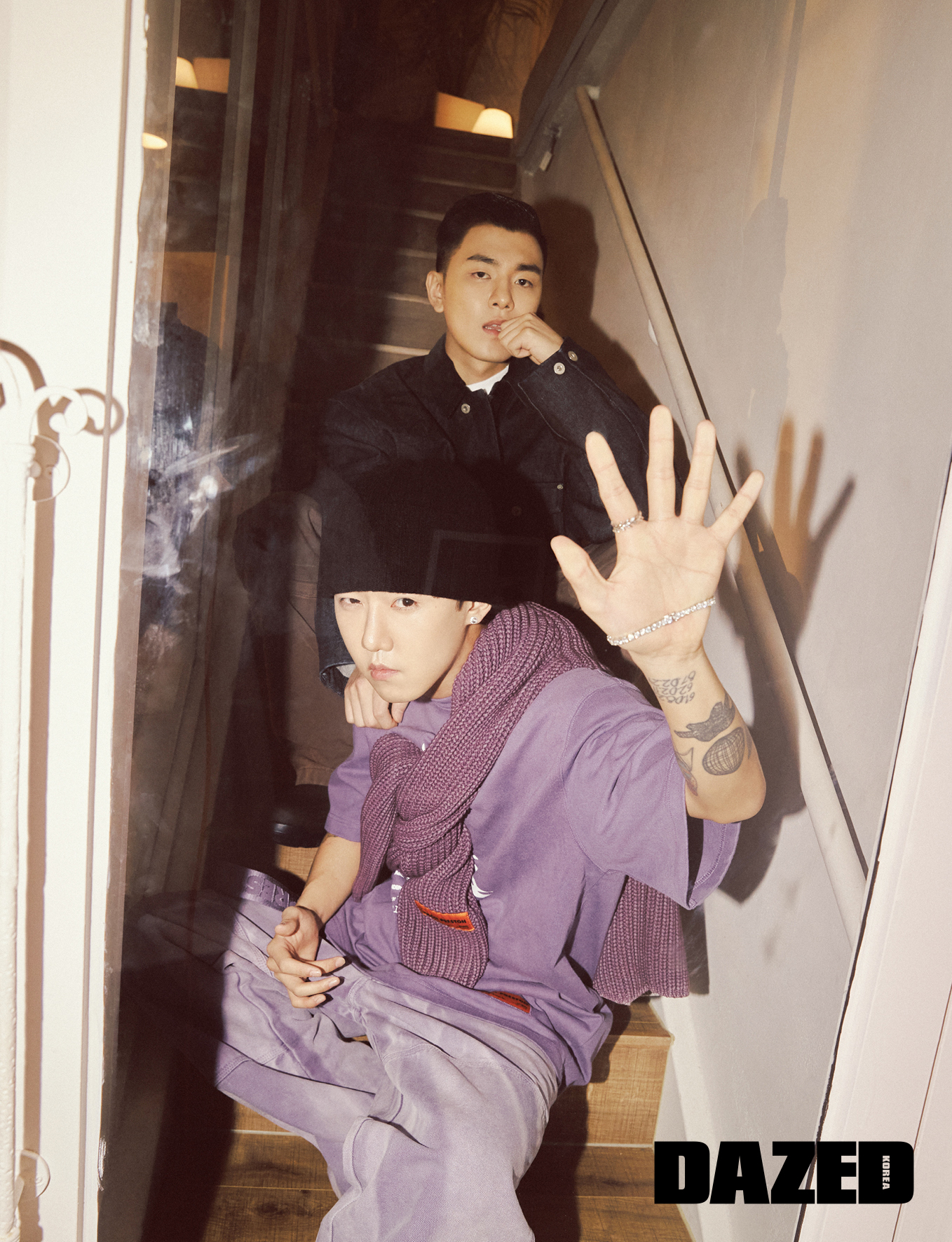 규정이 입은 트러커 데님 재킷과 화이트 티셔츠, 블랙 데님 팬츠는 모두 헤론 프레스턴(Heron Preston). 휘민이 입은 퍼플 티셔츠와 퍼플 플레인 스웨터, 퍼플 데님 팬츠는 모두 헤론 프레스턴(Heron Preston), 비니와 이어링, 네크리스, 브레이슬릿, 링은 휘민의 것.