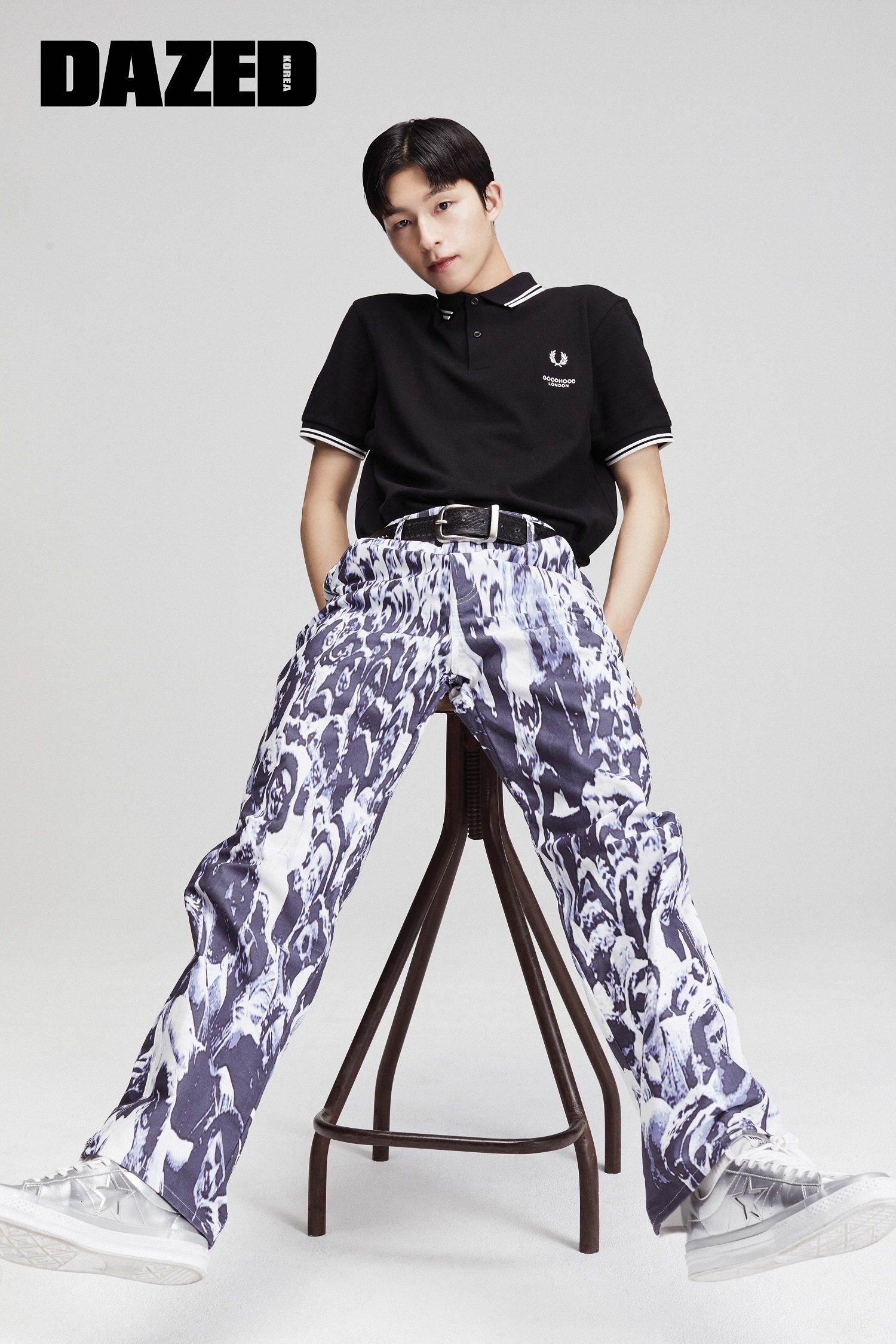 피케 셔츠는 프레드페리(Fred Perry), 데님 팬츠는 AFB, 스니커즈는 컨버스(Converse).