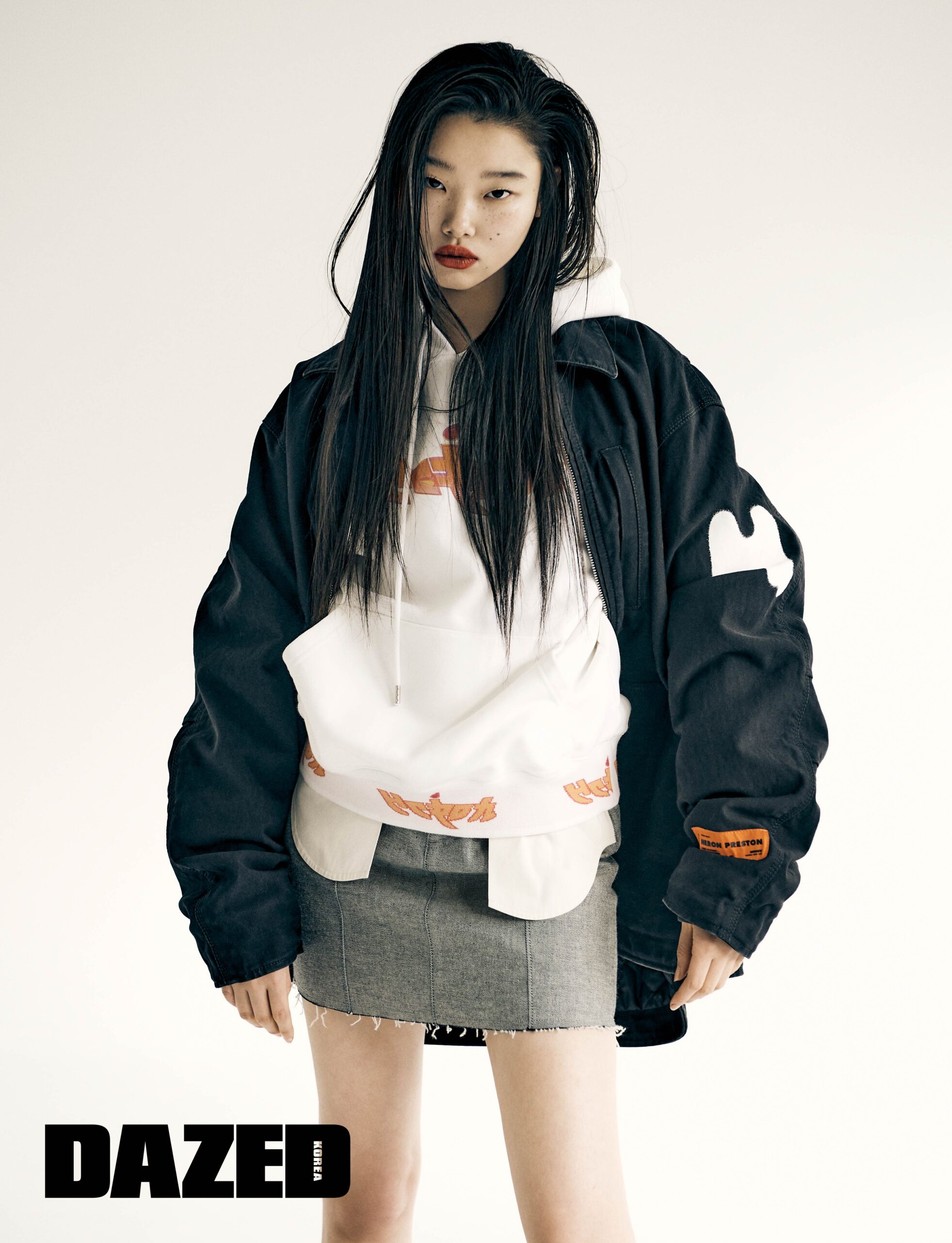 로고 패치 집업 재킷과 로고 프린트 후디, 포켓 디테일 데님 스커트는 모두 헤론 프레스턴(Heron Preston).
