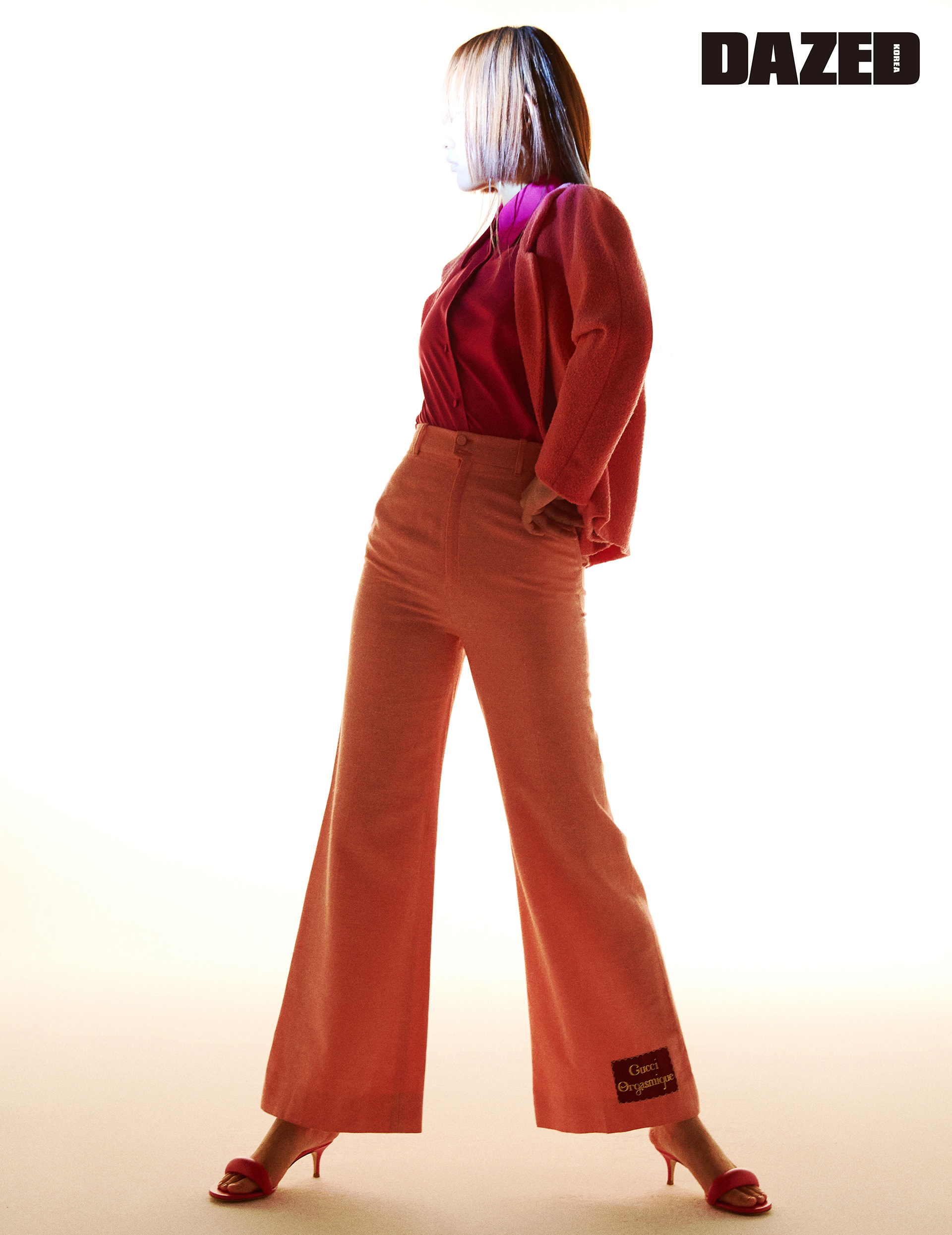 핑크 재킷과 실크 셔츠, 와이드 팬츠는 모두 구찌(Gucci), 뮬은 지안비토 로시(Gianvito Rossi).