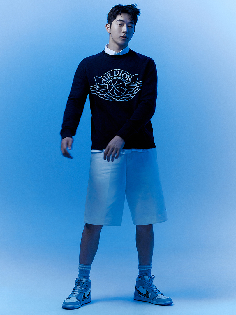 옐로 베스트와 재킷은 챈스챈스(Chance Chance), 그레이 팬츠와 커머번드는 디올 맨(Dior Men), 십자가 펜던트 실버 네크리스는 크롬하츠(Chrome Hearts), 실버 이어링은 스타일리스트의 것.