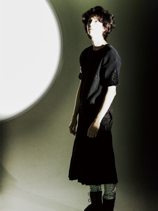 네이비 레더 컷아웃 재킷은 티센 by 지스트리트 494 옴므(T/Sehne by G.Street 494 Homme), 스트라이프 셔츠는 썬플라워(Sunflower), 드롭 이어링은 서울메탈(Seoulmetal).