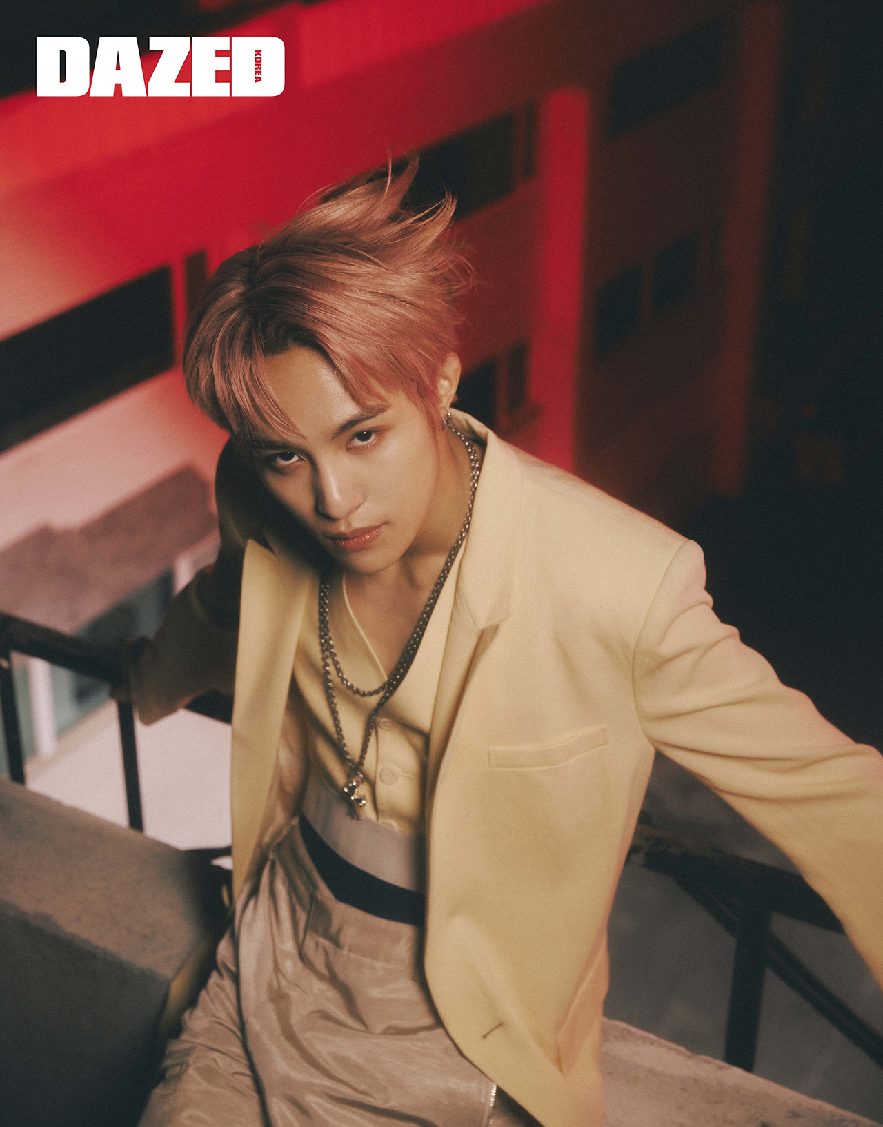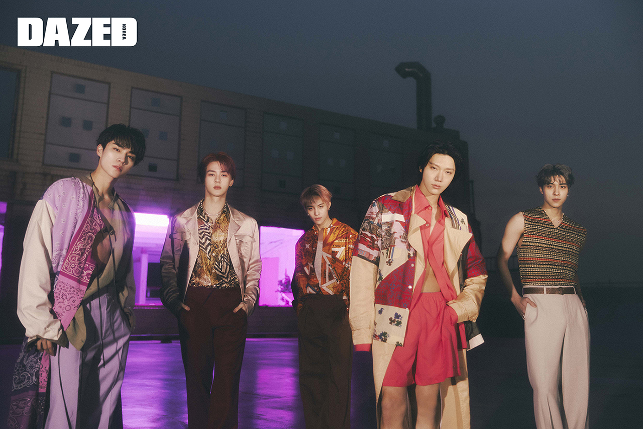 샤오쥔이 입은 반다나 패턴 롱 코트는 칠드런 오브 더 디스코댄스 by 무이(Children of the Discodance by MUE), 이너 셔츠는 르메르(Lemaire), 바이올렛 팬츠는 김서룡 옴므(Kimseoryong Homme). 쿤이 입은 실크 재킷은 생 로랑 by 무이(Saint Laurent by MUE), 애니멀 프린트 셔츠는 쿨 티엠 by 분더샵(Cool T.M by BOONTHESHOP), 버건디 팬츠는 김서룡 옴므(Kimseoryong Homme), 진주 네크리스는 클레버무브(Clever Move). 양양이 입은 이너 슬리브리스는 생 로랑 by 안토니 바카렐로(Saint Laurent by Anthony Vaccarello), 패턴 셔츠는 보디 by 지스트리트 494 옴므(Bode by G.Street 494 Homme), 브라운 팬츠는 이구일(Iguill), 오른쪽 귀에 착용한 이어링은 휴스타드(Hustad), 왼쪽 귀에 착용한 이어링은 본인의 것. 텐이 입은 옐로 롱 코트는 김서룡 옴므(Kimseoryong Homme), 아우터로 활용한 패턴 셔츠는 사카이 by 분더샵(Sacai by BOONTHESHOP), 핑크 이너 셔츠와 쇼츠는 윤세(Yunse). 헨드리가 입은 니트 베스트는 랑방 by 분더샵(Lanvin by BOONTHESHOP), 베이지 팬츠는 산드로 옴므(Sandro Homme), 비즈 장식 네크리스는 서울메탈(Seoulmetal), 이어링은 지예 신(Jiye Shin), 브라운 벨트는 스타일리스트의 것.
