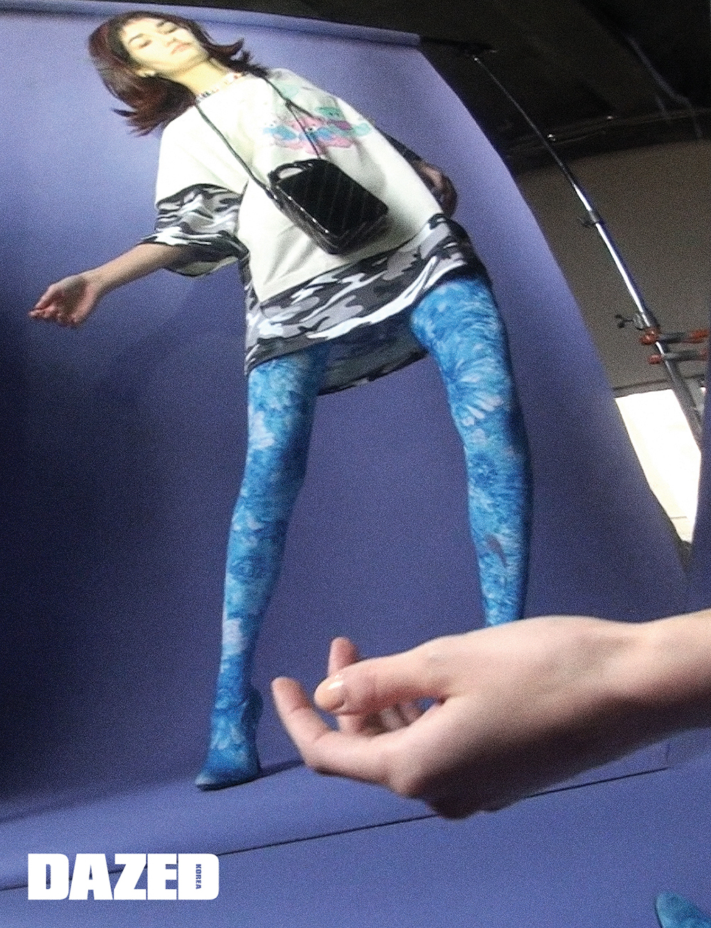 더블 레이어드 티셔츠와 토이 초커 네크리스, 폰 홀더 미니 백, 패턴 팬타 레깅스 슈즈는 모두 발렌시아가(Balenciaga).