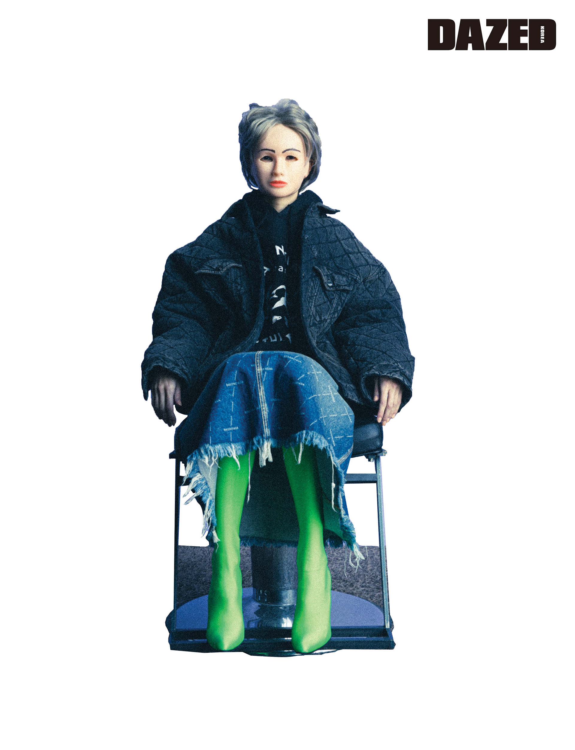 퀼티드 데님 재킷과 보머 후디, 데님 스커트, 네온 컬러 팬타 레깅스 슈즈는 모두 발렌시아가(Balenciaga).