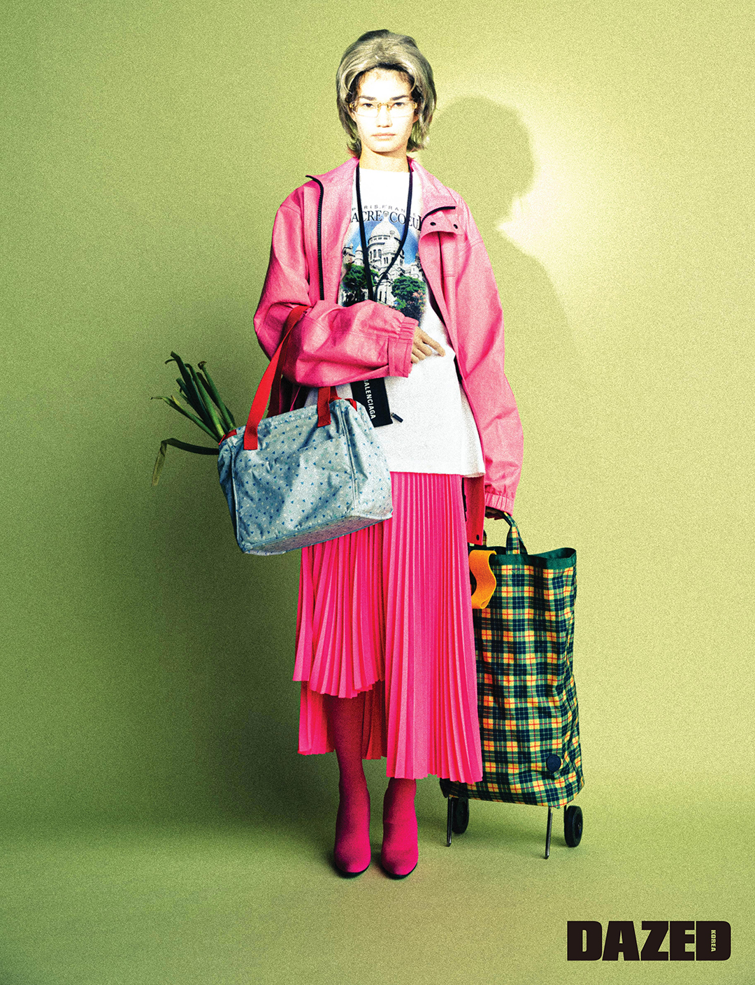 핑크 라이트 파카와 커브드 티셔츠, 네온 핑크 플리츠스커트, 로고 카드지갑, 핑크 팬타 레깅스 슈즈는 모두 발렌시아가(Balenciaga).