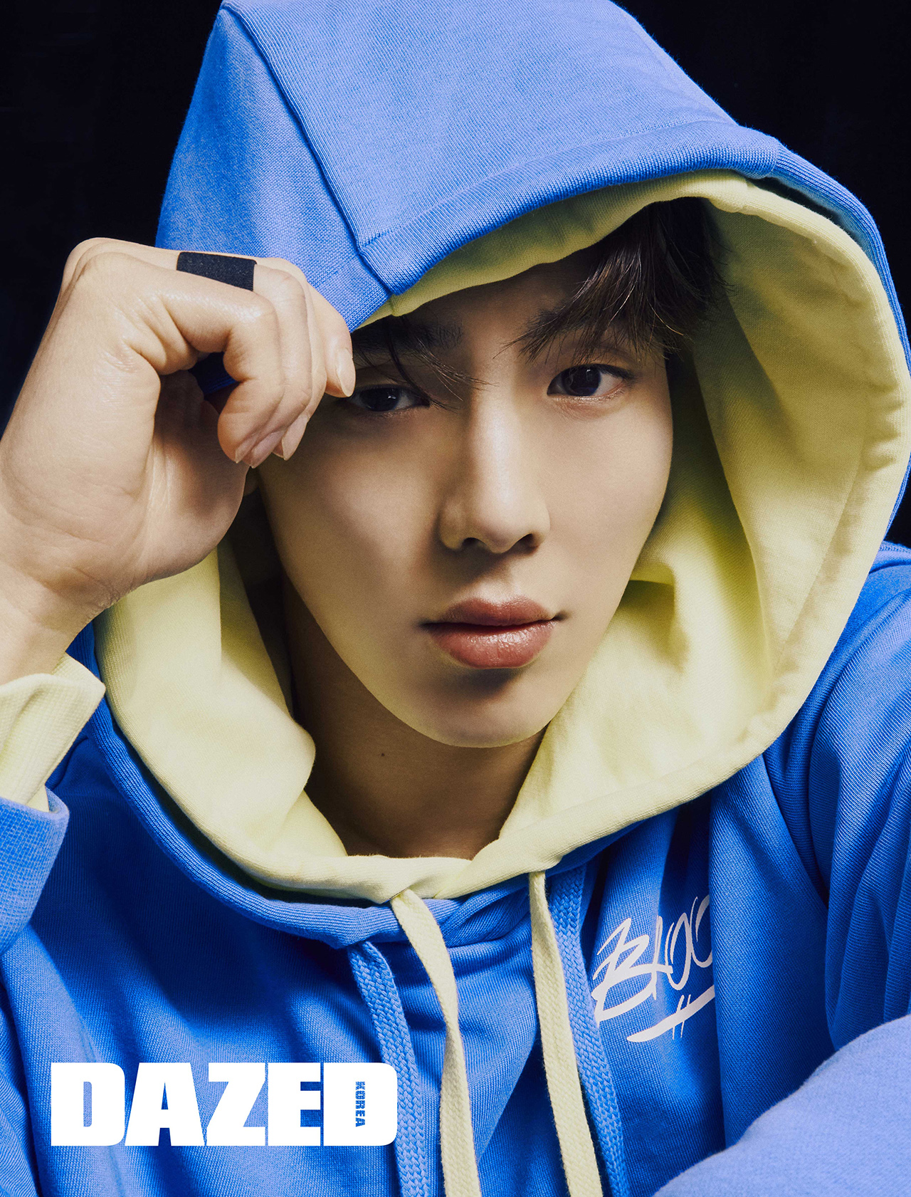 레터링 블루 후디와 이너로 입은 네온 컬러 후디, 링으로 연출한 헤어밴드는 모두 브룩스(Brooks).