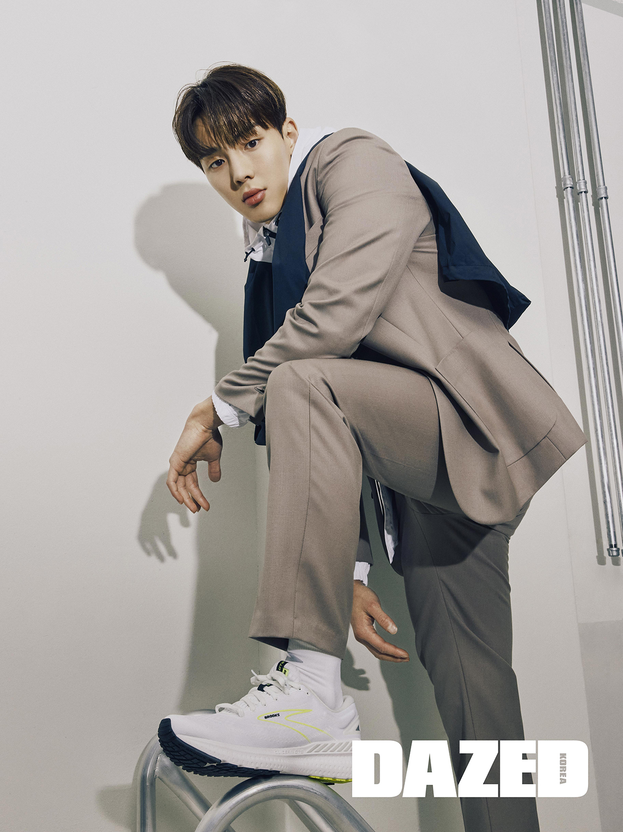 화이트 윈드브레이커와 이너로 입은 블랙 톱, 어깨에 걸친 블랙 윈드브레이커, 메시 어퍼 러닝 슈즈 ‘글리세린 GTS 19’, 부토니에로 연출한 헤어밴드, 화이트 삭스는 모두 브룩스(Brooks). 베이지 재킷과 팬츠 셋업은 스타일리스트의 것.