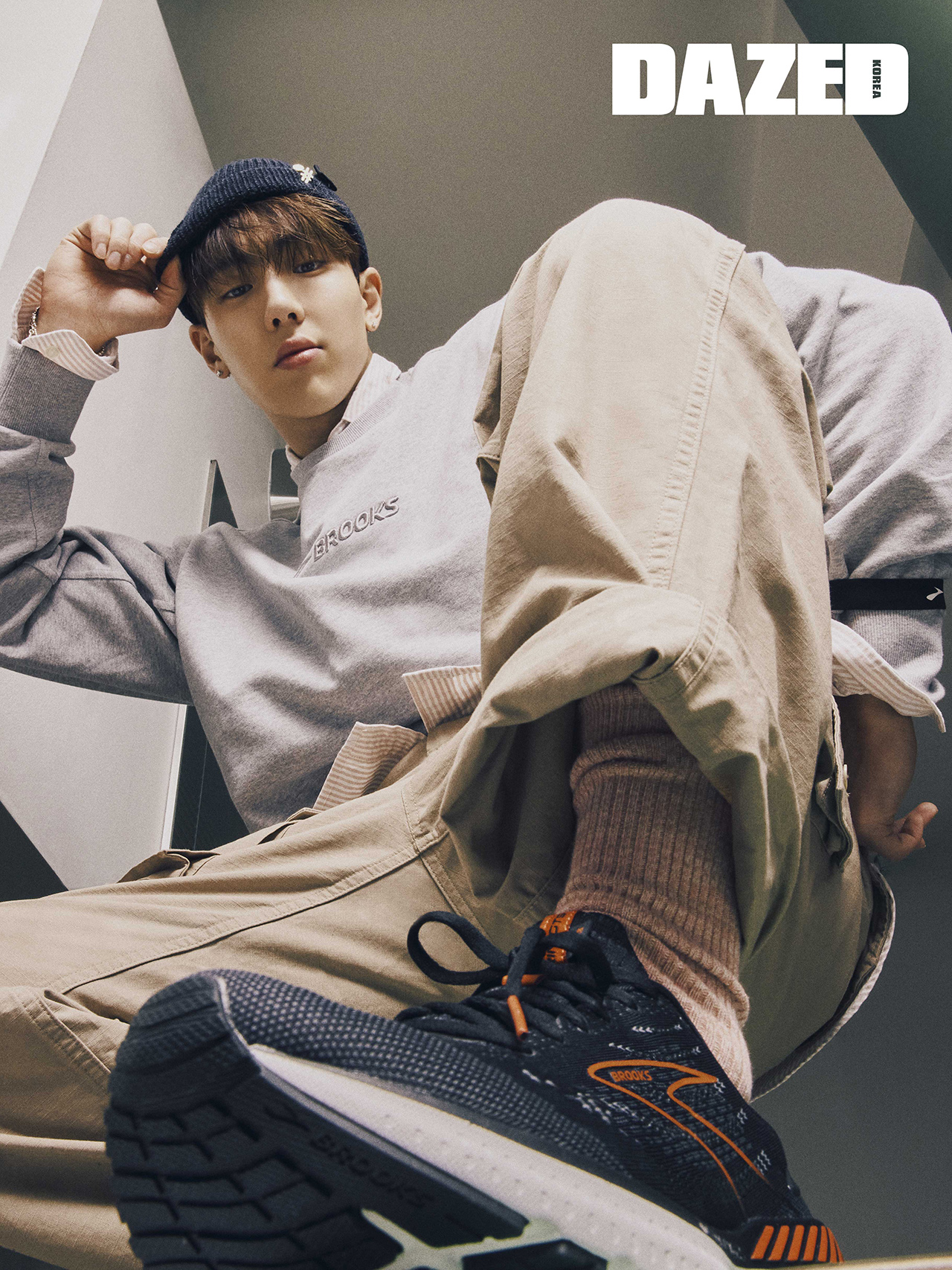 그레이 스웨트셔츠와 메시 어퍼 러닝 슈즈 ‘글리세린 GTS 19’, 블랙 브레이슬릿은 모두 브룩스(Brooks). 이너로 입은 핑크 스트라이프 셔츠는 나나미카 by 비이커(Nanamica by Beaker), 베이지 카고 팬츠는 엔지니어드 가먼츠 by 비이커(Engineered Garments by Beaker), 블랙 비니와 베이지 삭스는 스타일리스트의 것.