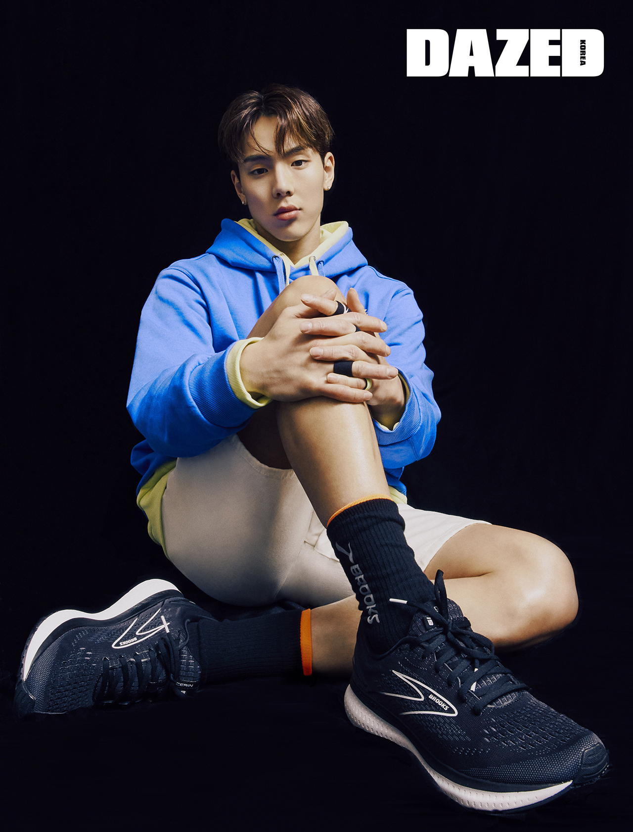 레터링 블루 후디와 이너로 입은 네온 컬러 후디, 메시 어퍼 러닝 슈즈 ‘글리세린 19’, 블랙 삭스, 레이어드한 오렌지 삭스, 링으로 연출한 헤어밴드는 모두 브룩스(Brooks). 화이트 쇼츠는 산드로 옴므(Sandro Homme).