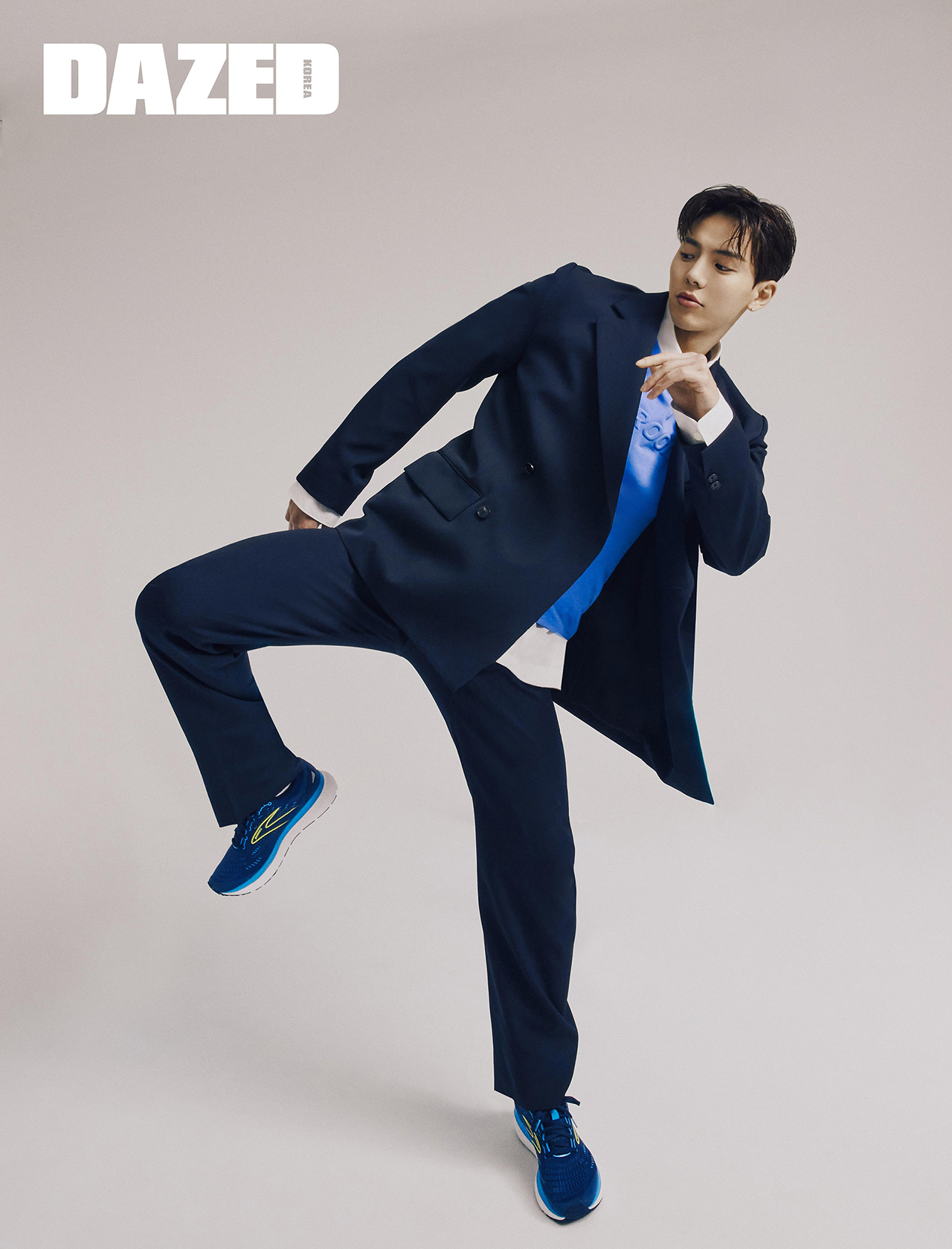 블루 톱과 메시 어퍼 러닝 슈즈 ‘글리세린 19’, 삭스는 모두 브룩스(Brooks). 네이비 재킷과 팬츠 셋업은 오라리 by 비이커(Auralee by Beaker), 이너로 입은 화이트 셔츠는 띠어리(Theory).