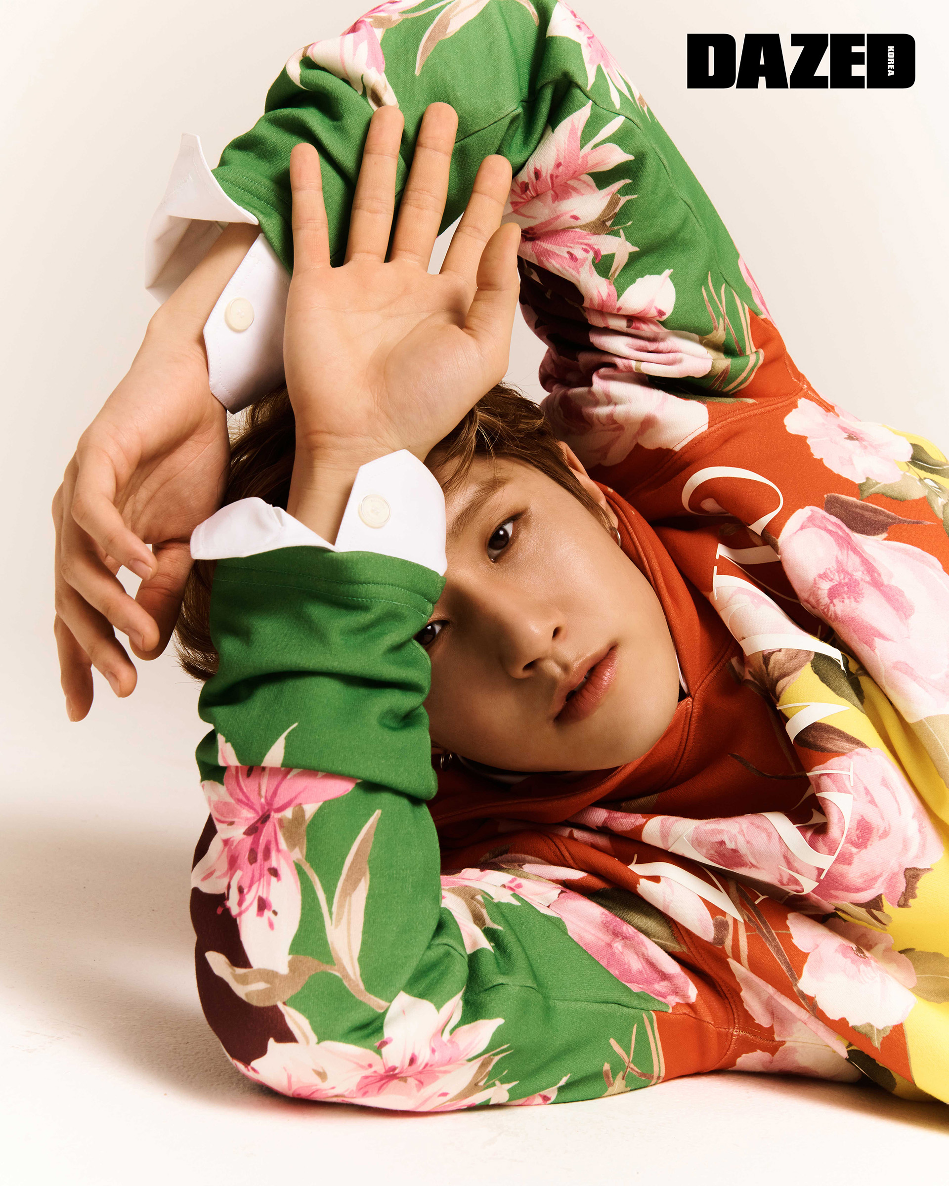 플라워 프린트 후드 톱과 이너로 입은 화이트 셔츠, 팬츠는 모두 발렌티노(Valentino), 이어링은 스타일리스트의 것.